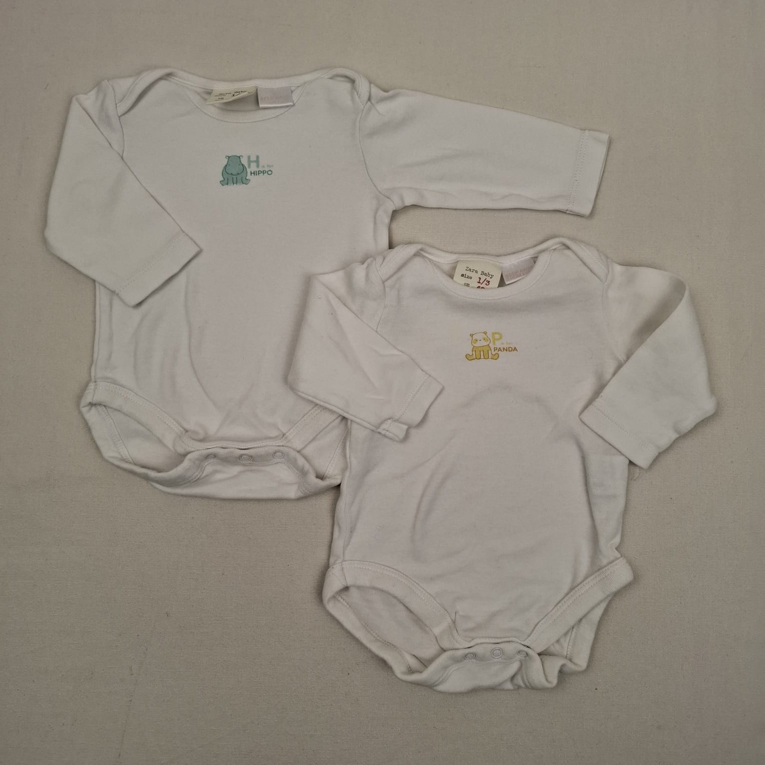 Autres commentaires : Lot de 2 bodies blancs à manches longues : – un avec devant un mini hippopotame vert menthe avec inscription « H is for HIPPO » – un avec devant un mini panda jaune avec inscription « P is for PANDA ».