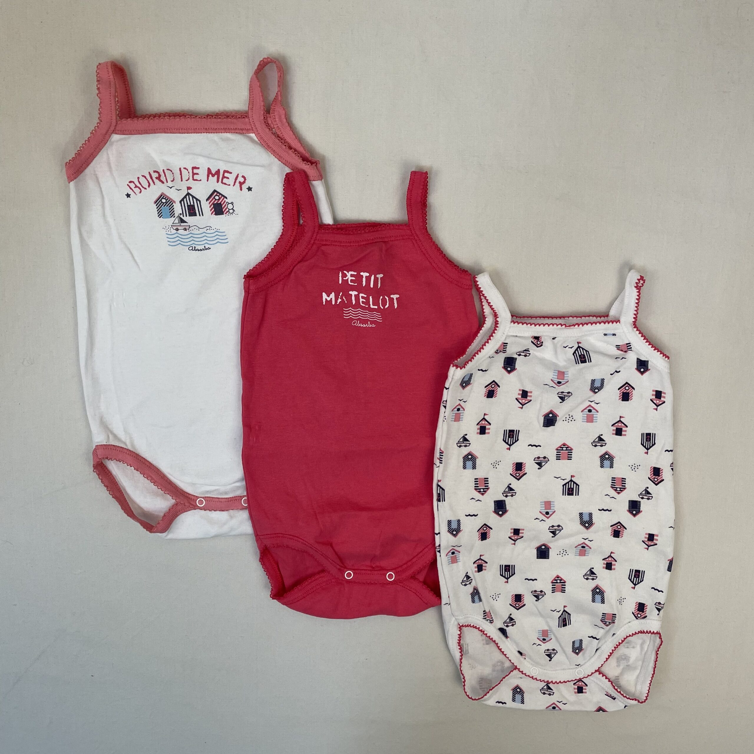 • Lot de 3 bodies à bretelles, liseré dentelé : – 1 blanc parsemé de petites cabines de plage et de petits bateaux bleus et roses. – 1 rose vif, devant inscription « Petit matelot » en blanc souligné par des vaguelettes blanches. – 1 blanc à bordure rose thé, devant motifs de cabines de plage avec petit bateau et inscription en rose « Bord de mer ».