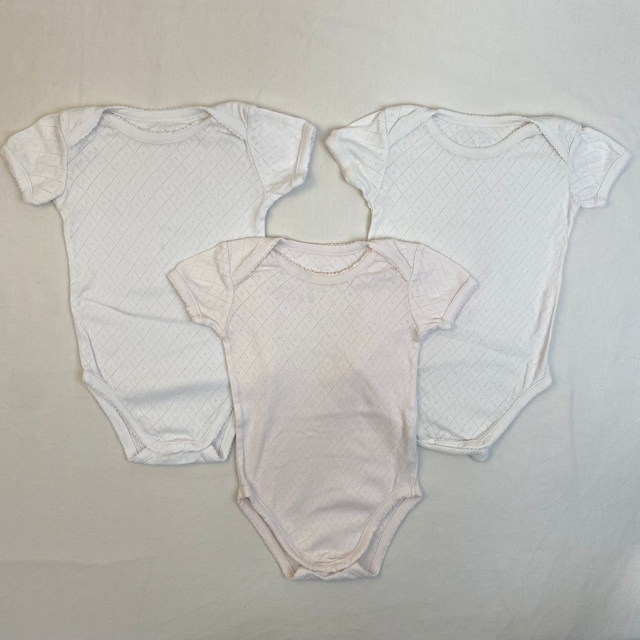 Lot de 3 bodies ajouré en croisillons, avec col et manche courtes au liseré dentelé : – 1 rose pâle et 2 blancs.