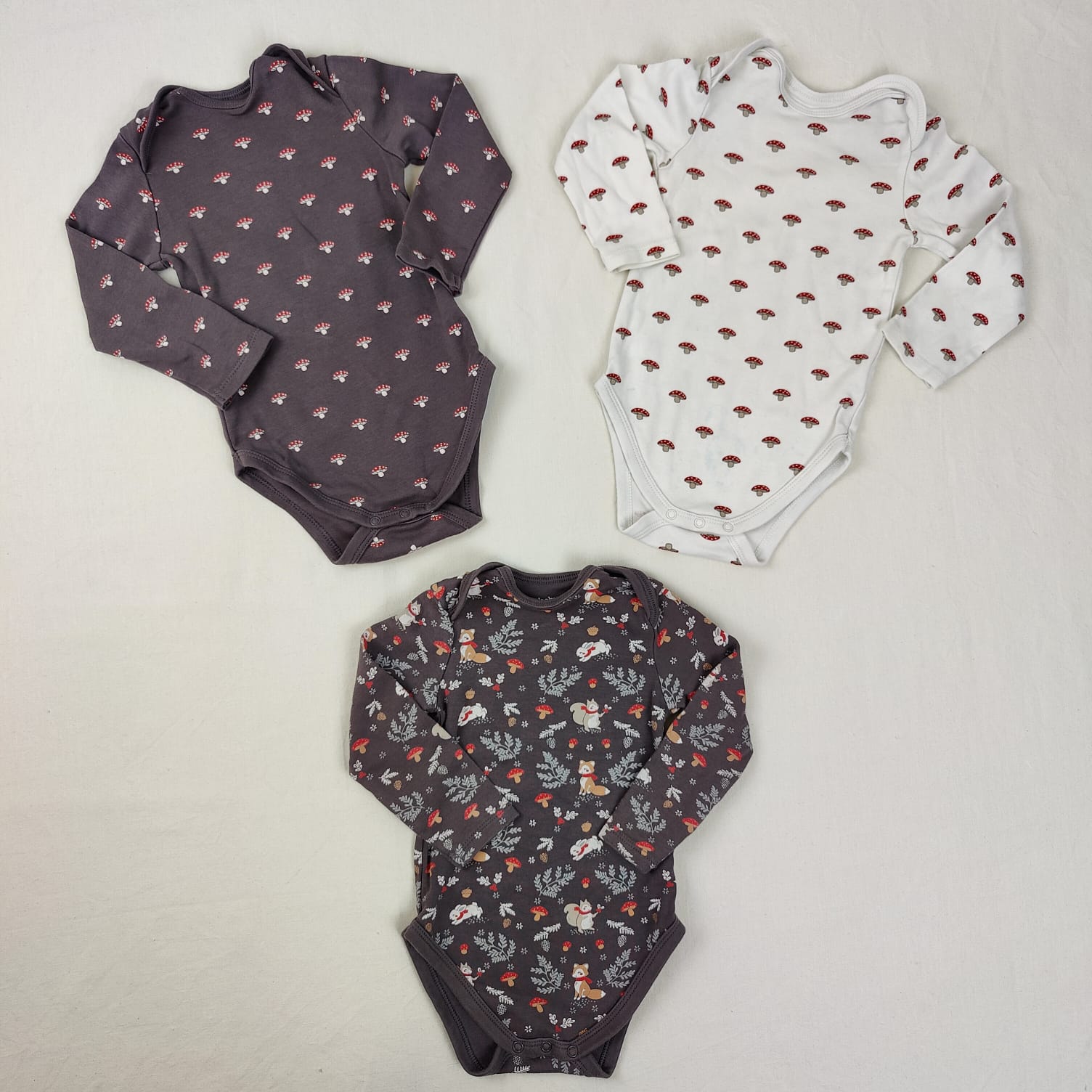 Autres commentaires : 3 Bodies un blanc avec motifs champignons et 2 taupe motifs champignions et animaux de la forêt