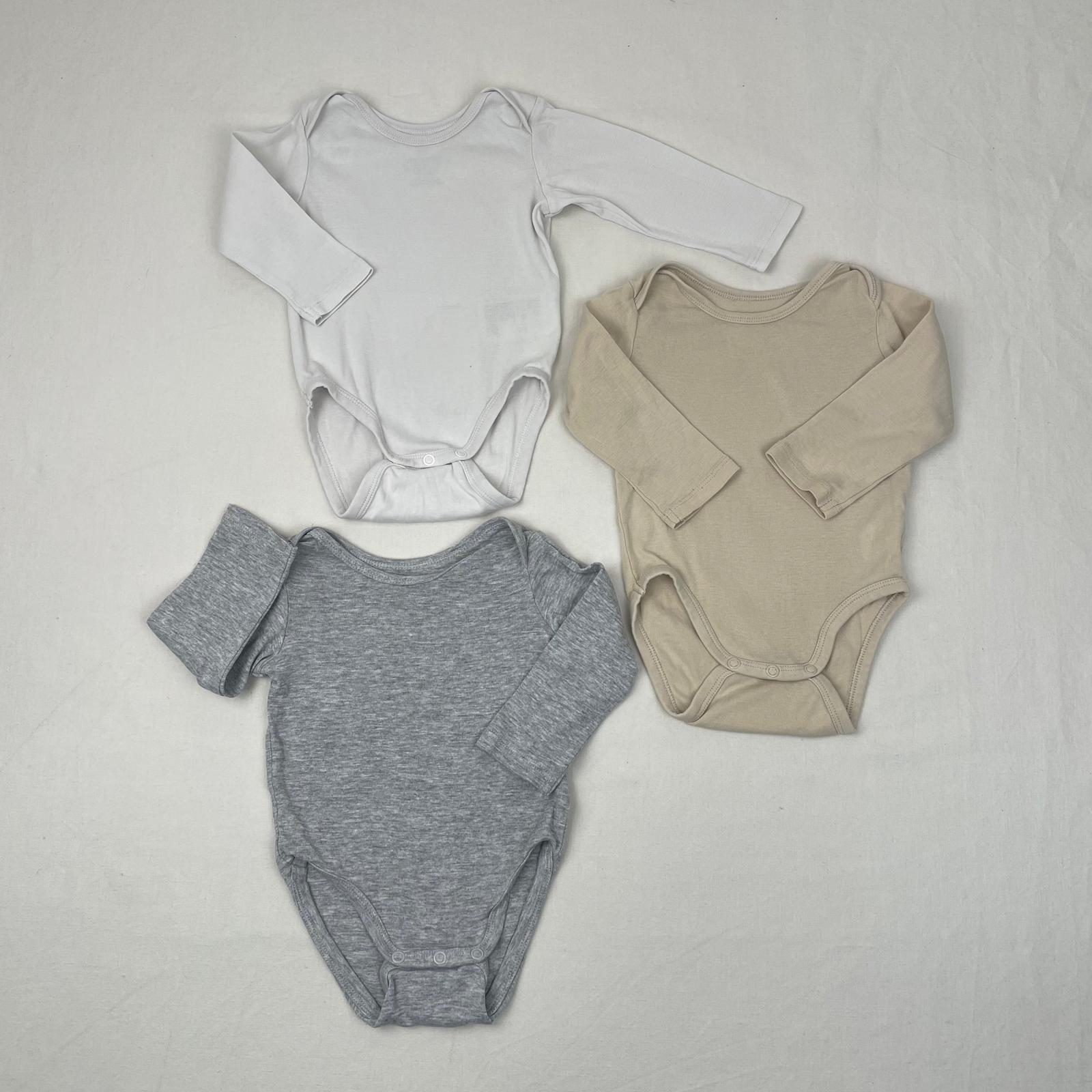 Autres commentaires : 3 bodies, manches longues, 5% viscose en gris, blabc et beige, fermeture par boutons pression au bas, il y a une tache au dos du body gris.