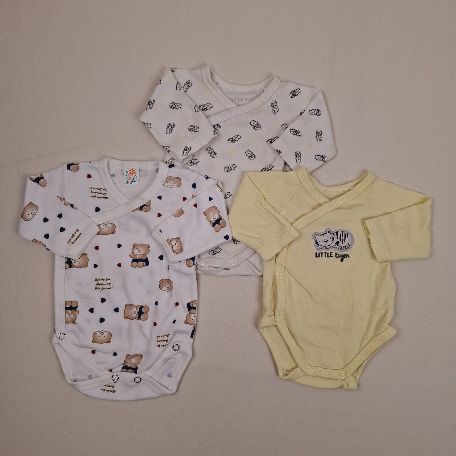 Autres commentaires : Lot de 3 Bodies manches longues 1M fermeture boutons pressions sur le côté : un In extenso jaune avec motif de tigre, un In extenso blanc avec motifs de tigres et un TEX blanc avec motifs oursons