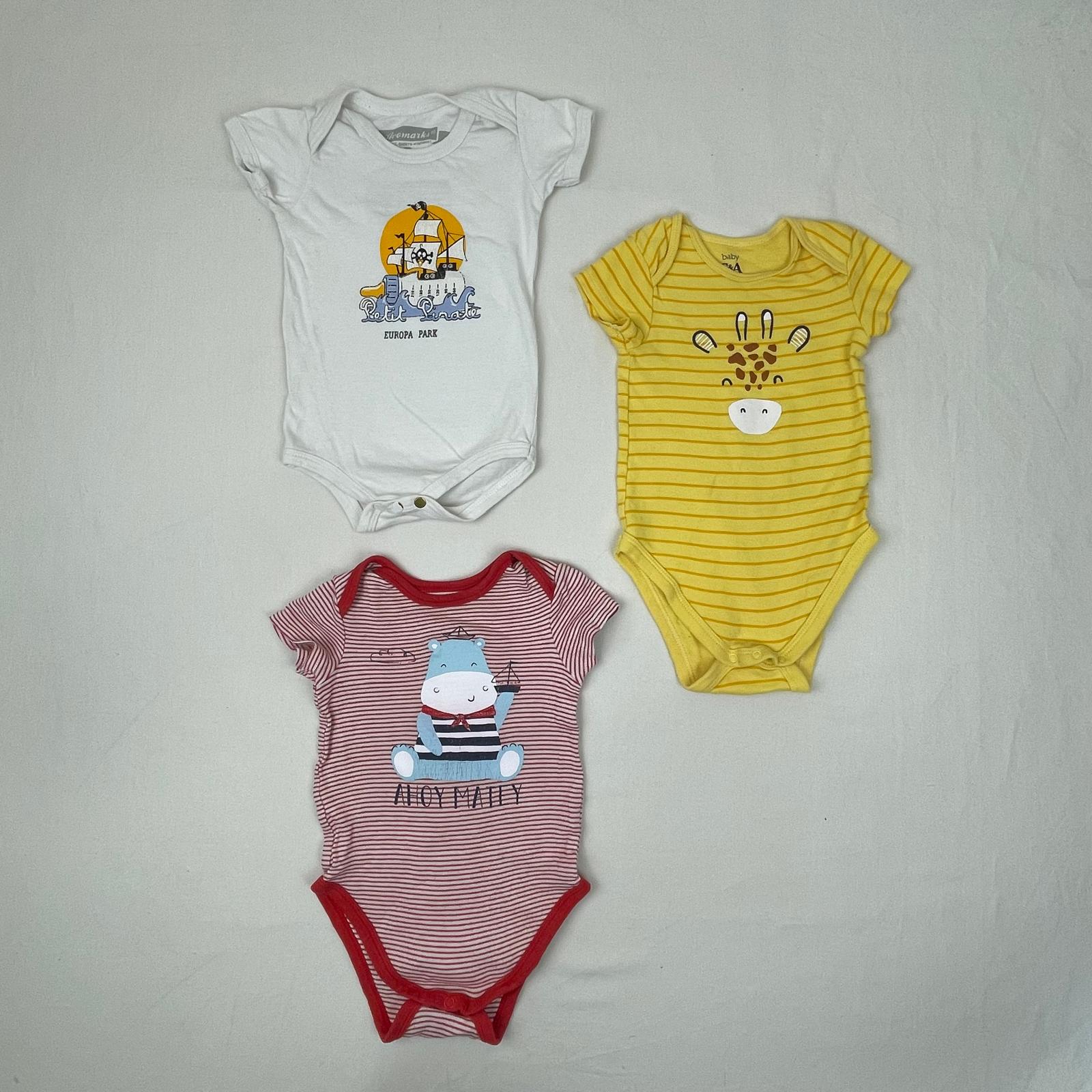 Autres commentaires : Lot de 3 bodies manches courtes : – Un jaune C&A Baby, à rayures jaune foncé, devant moitf tête de girafe, 100% coton. – Un blanc à rayures et bords rouges C&A Baby, devant, motif hippopotame marin avec l’inscription « Ahoy Matey », 100% coton. – Un blanc Avomarks , devant, motif de bateau pirate avec les inscriptions « Petit Pirate » et « Europa Park ». Les motifs des deux derniers sont un peu craquelés.