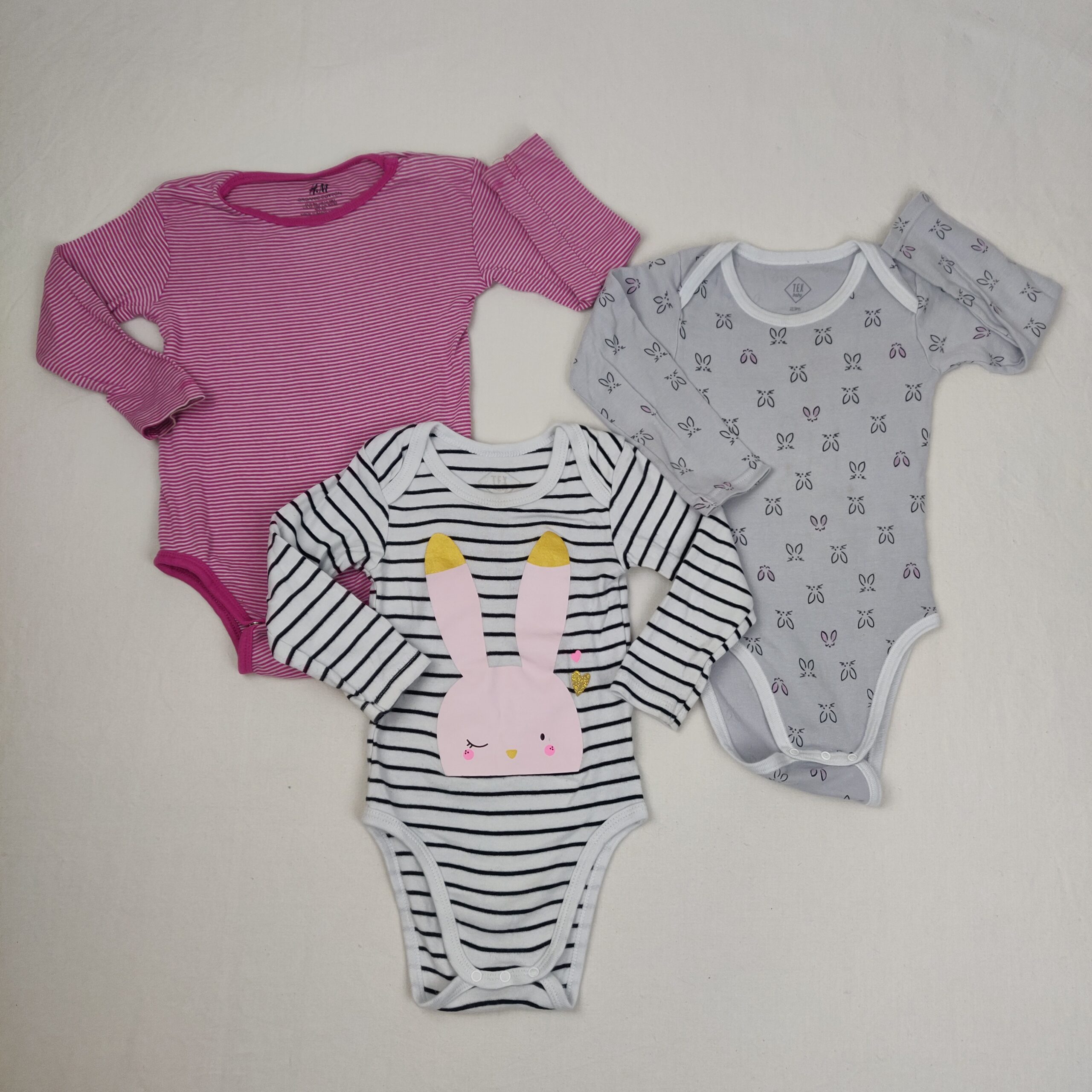 Autres commentaires : 3 bodies manches longues, 2 TEX dont un blanc à rayures noires, motifs lapine sur poitrine, un gris motif petites lapines, et un H&M rose à rayures