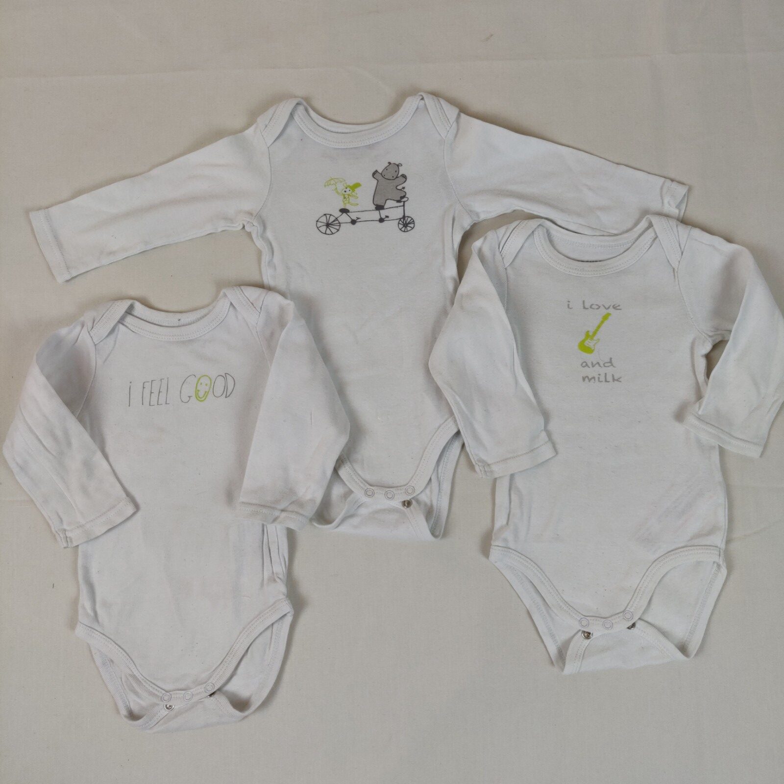 Autres commentaires : Lot de 3 bodies à manches longues – blanc. Un body avec inscription centrale marron et verte « I Feel good ». Un body avec motif central marron et vert souris et hippopotame en équilibre sur un tadem. Un body avec inscription hybride avec une guitare électrique ‘I love guitar and milk ». Léger effet pelucheux.