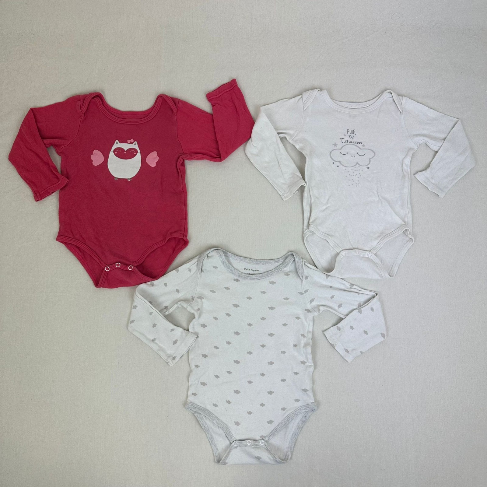 Autres commentaires : 3 Bodies manches longues: 2 bodies blanc et un body rose avec une nuage.