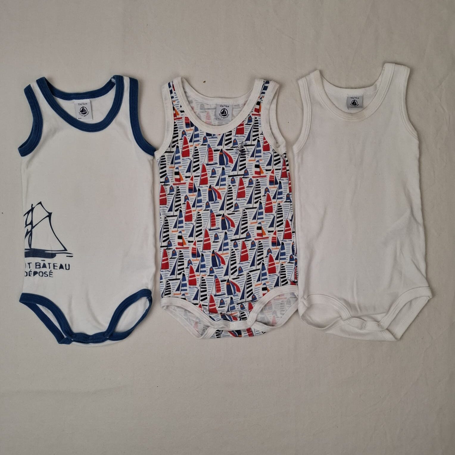 Autres commentaires : Lot de 3 bodys sans manches, col rond: -Blanc. – Blanc à motif bateaux rouges et bleus. -Blanc à motif bateau et inscription « Petit bateau déposé ».