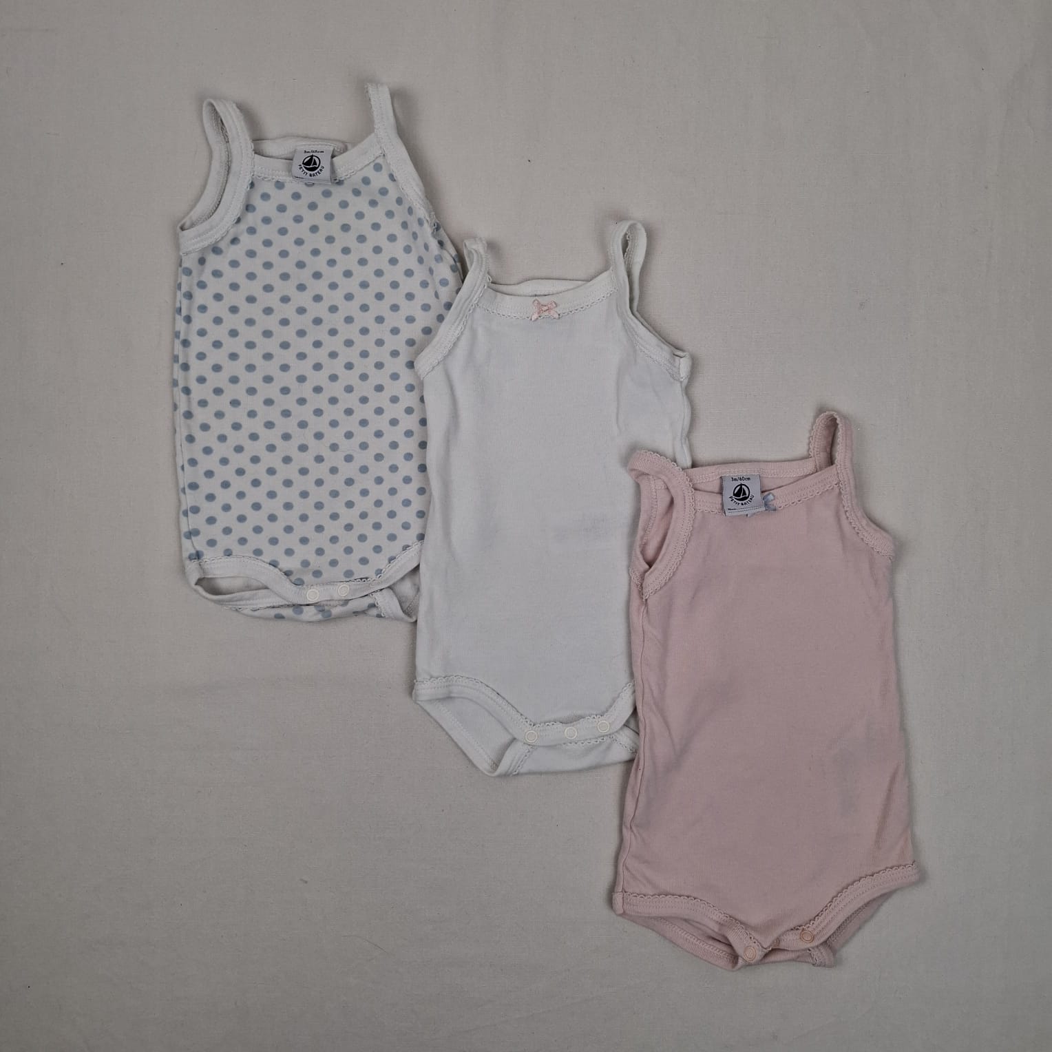 Autres commentaires : Lot de 3 bodies à bretelles avec liseré dentelé : – un rose clair. uni – un blanc uni. – un blanc à pois bleu clair.