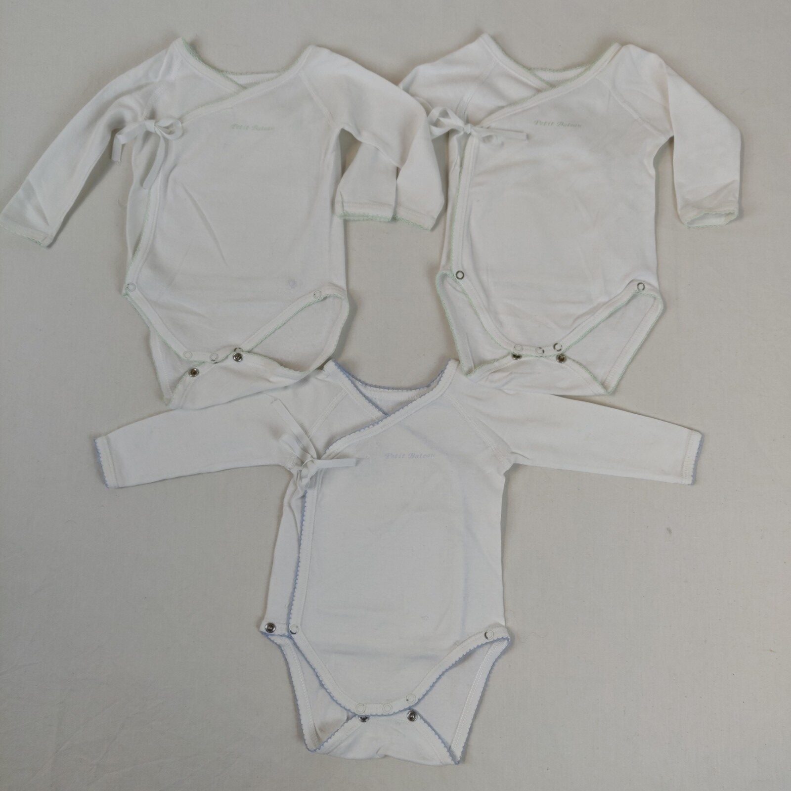 Autres commentaires : Lot de 3 bodies cache coeur à manches longues – blanc. Attache à l’aide de pressions et d’un ruban. Deux bodies avec inscription centrale verte « Petit Bateau ». Un body avec inscription centrale bleue « Petit Bateau ». Usure normale des bodies.