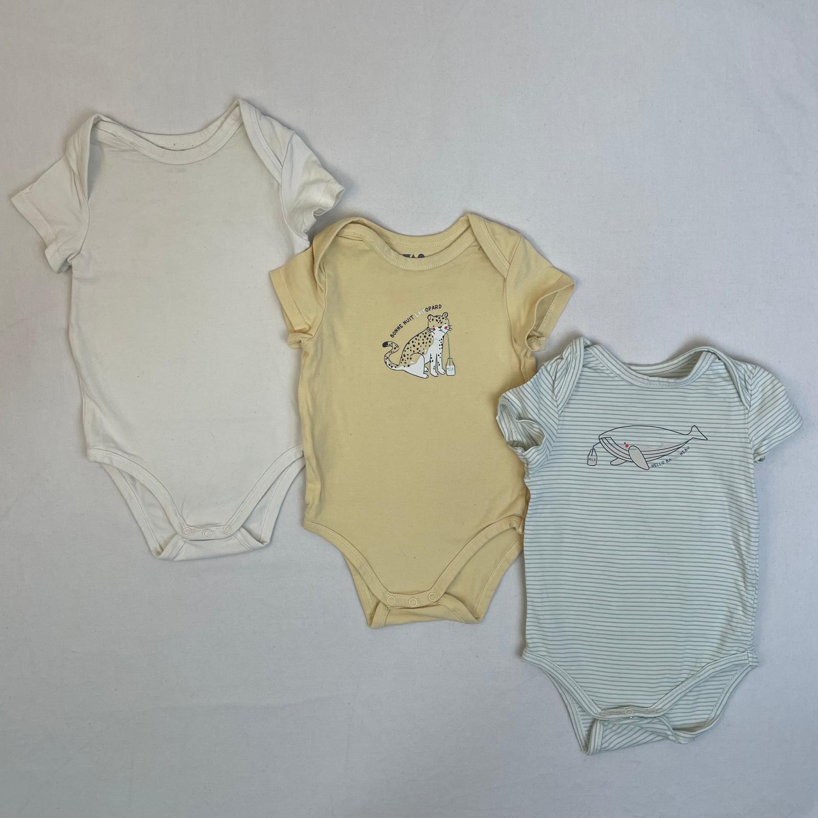 Lot de 3 bodies manches courtes : – 1 de couleur vanille, devant motif léopard et inscription « Bonne nuit LAITopard ». – 1 blanc à rayures vert pistache, devant motif baleine et inscription « Hello baLAITneau ». – 1 blanc uni.