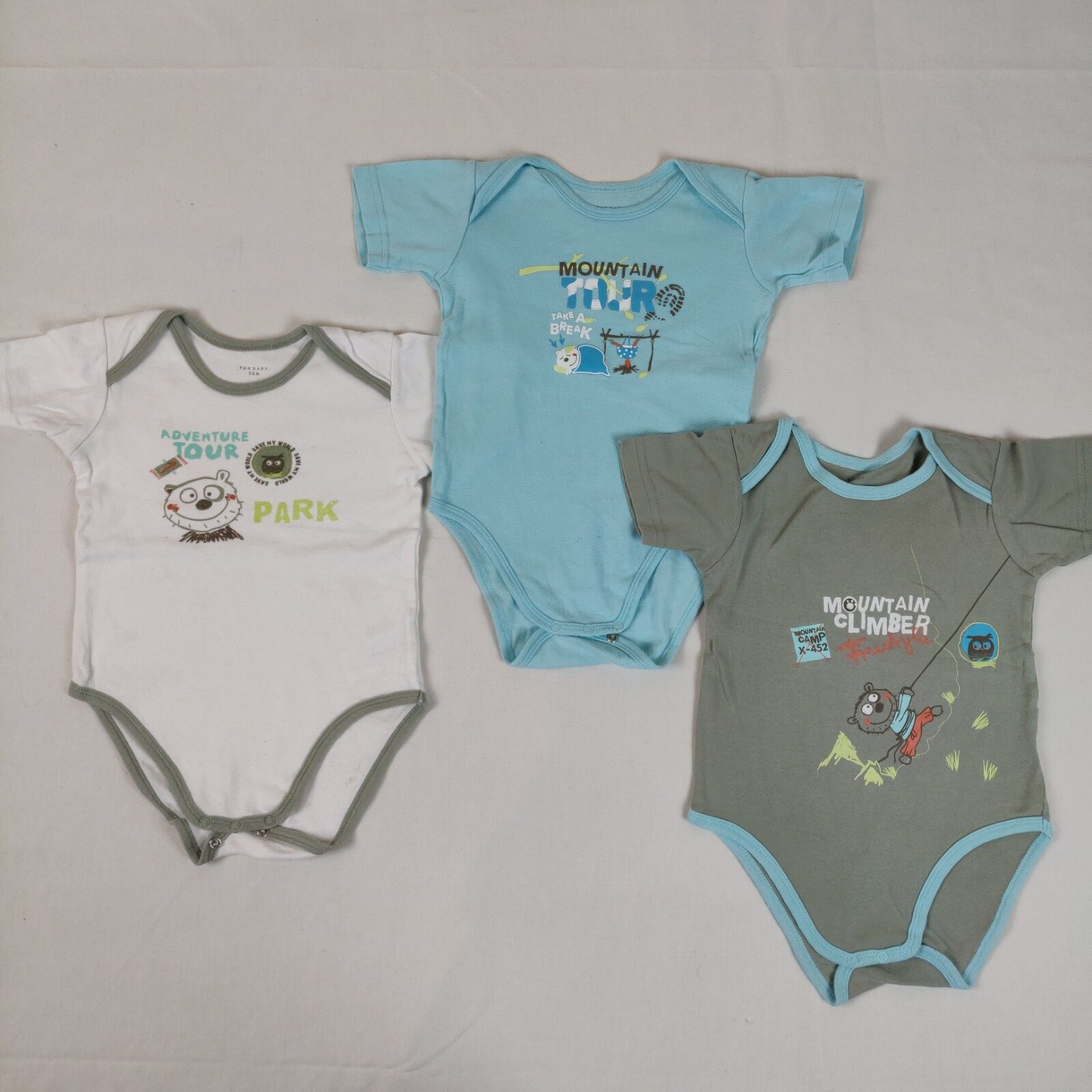 Autres commentaires : Lot de 3 bodies à manches courtes. 1 body écru à motif ours et chouette et inscription « Save my world. Adventure tour park ». 1 body bleu avec motif ours au feu de camp avec inscription « Mountain tour. Take a break ». 1 body marron glacé avec motif ours escaladeur et inscription « Mountain climber freestyle ». Léger effet pelucheux.