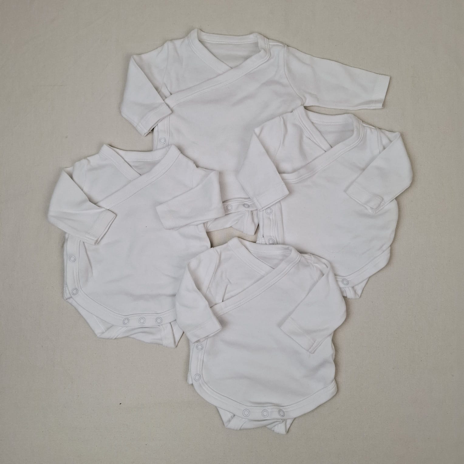 Autres commentaires : lot de 4 bodies blancs croisés à manches longues, fermeture par boutons pression sur les côtés.