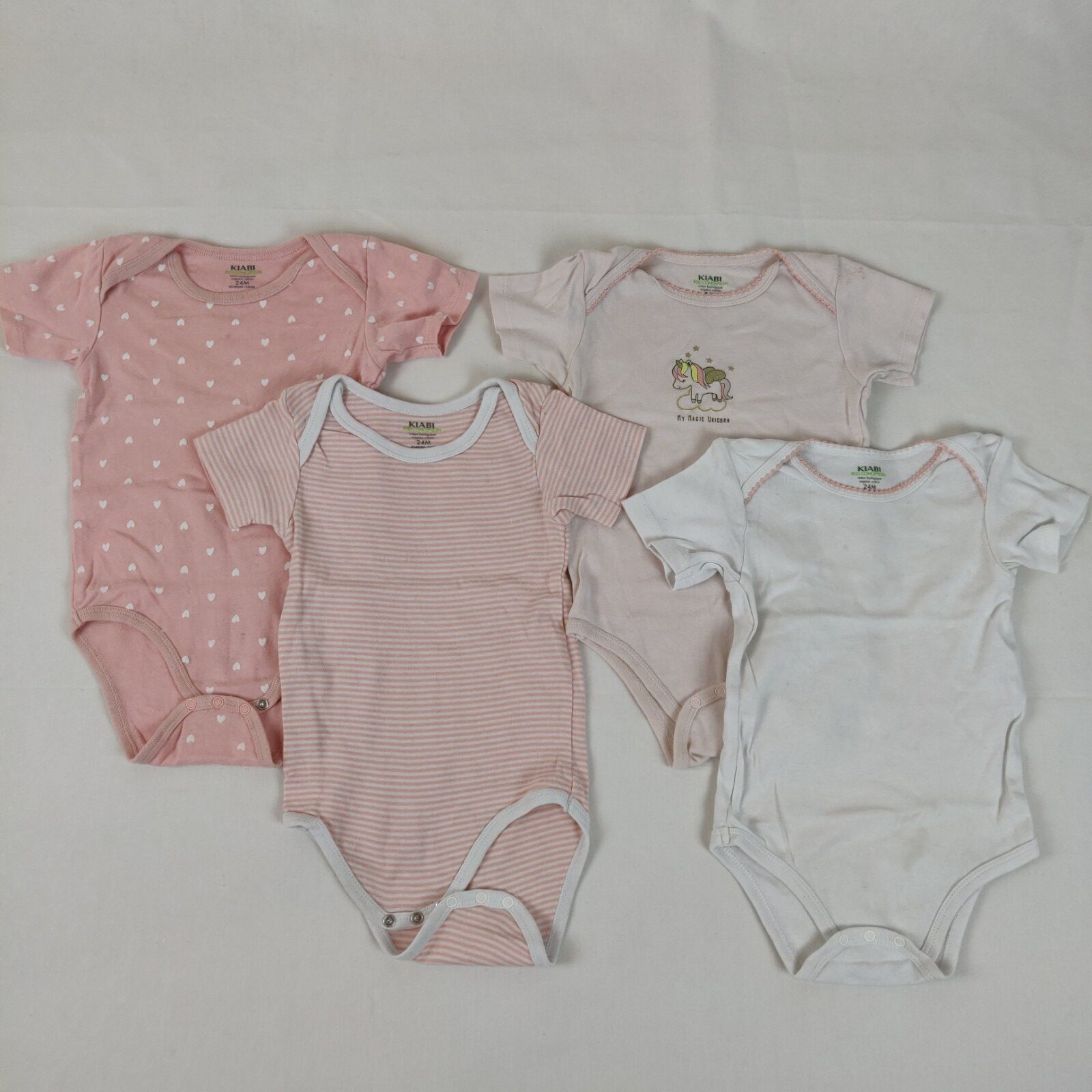 Autres commentaires : Lot de 4 bodies à manches courtes. Un body rayé blanc et rose. Un body blanc avec de la dentelle rose au col. Très discrètes tâches dans le haut. Un body rose clair avec motif central licorne accompagné de l’inscription « My magic unicorn ». Dentelle rose au col. Petites tâches noires sur le haut de la manche gauche. Un body rose à motifs coeurs blancs. Très discrètes tâches dans le haut.