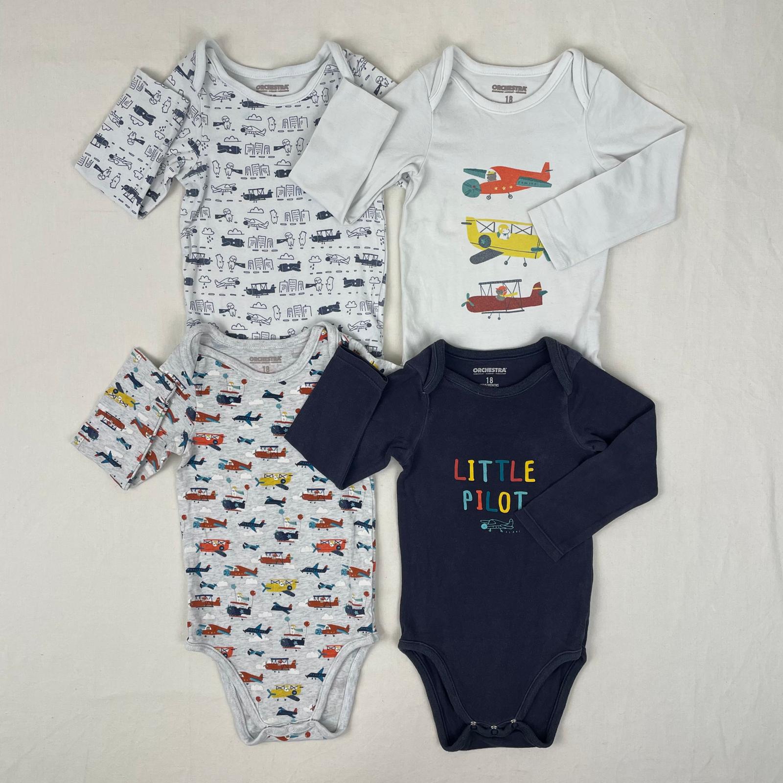 5% elasthanne. 4 bodies manches longues, blanc et bleu foncé, motif avions.
