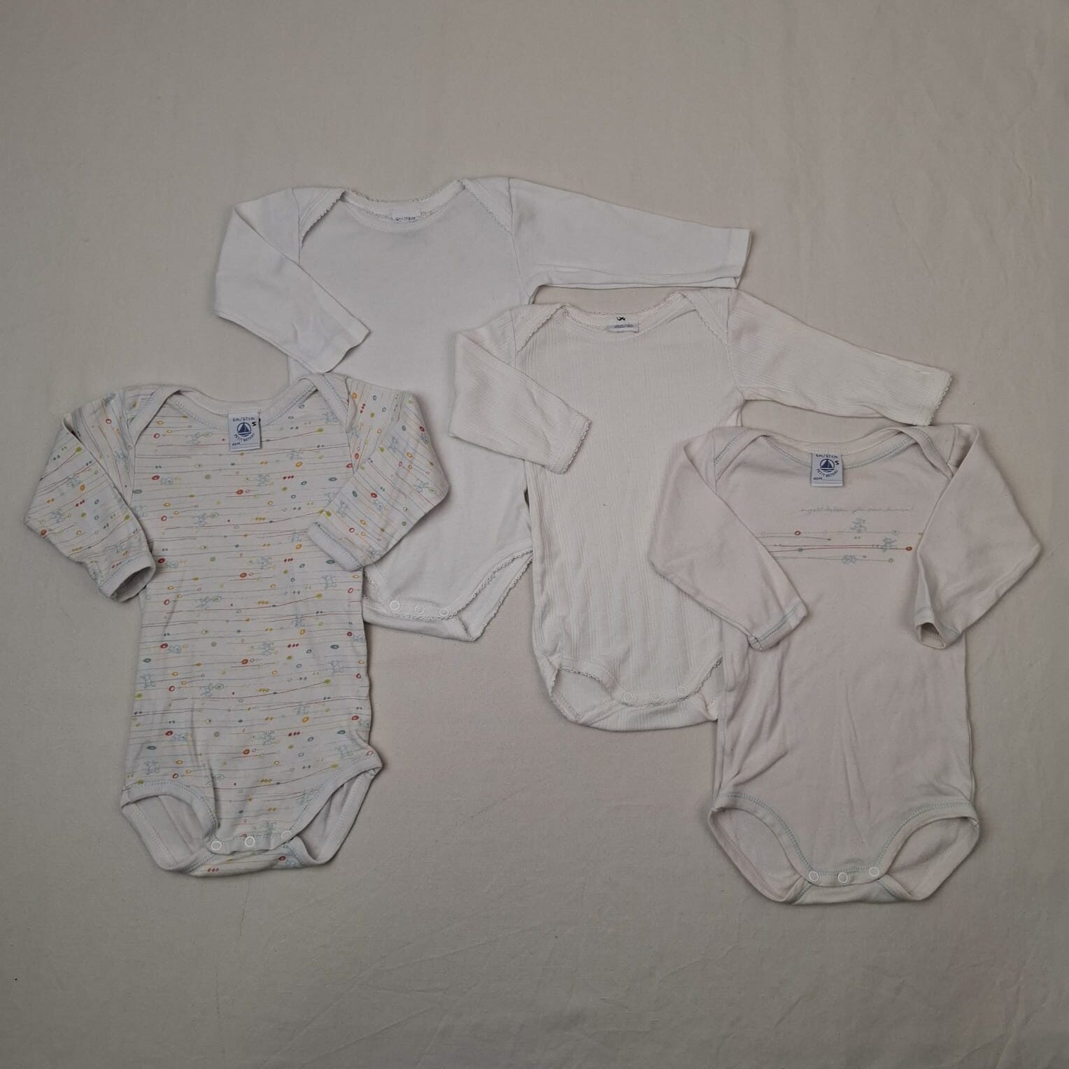 Autres commentaires : Lot de 4 bodys à manches longues, col US: – 2 blanc uni. – Blanc à imprimé. – Blanc uni côtelé.