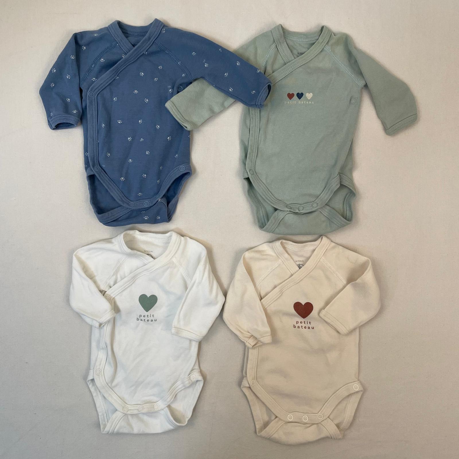 - Lot de 4 bodies croisés manches longues : – un vert avec rappel de la marque devant avec 3 petits coeurs. – un bleu ardoise parsemé de mini empreintes blanches animales. – un couleur crème, devant rappel de la marque avec un coeur marron. – un blanc cassé, devant rappel de la marque avec un coeur vert amande.