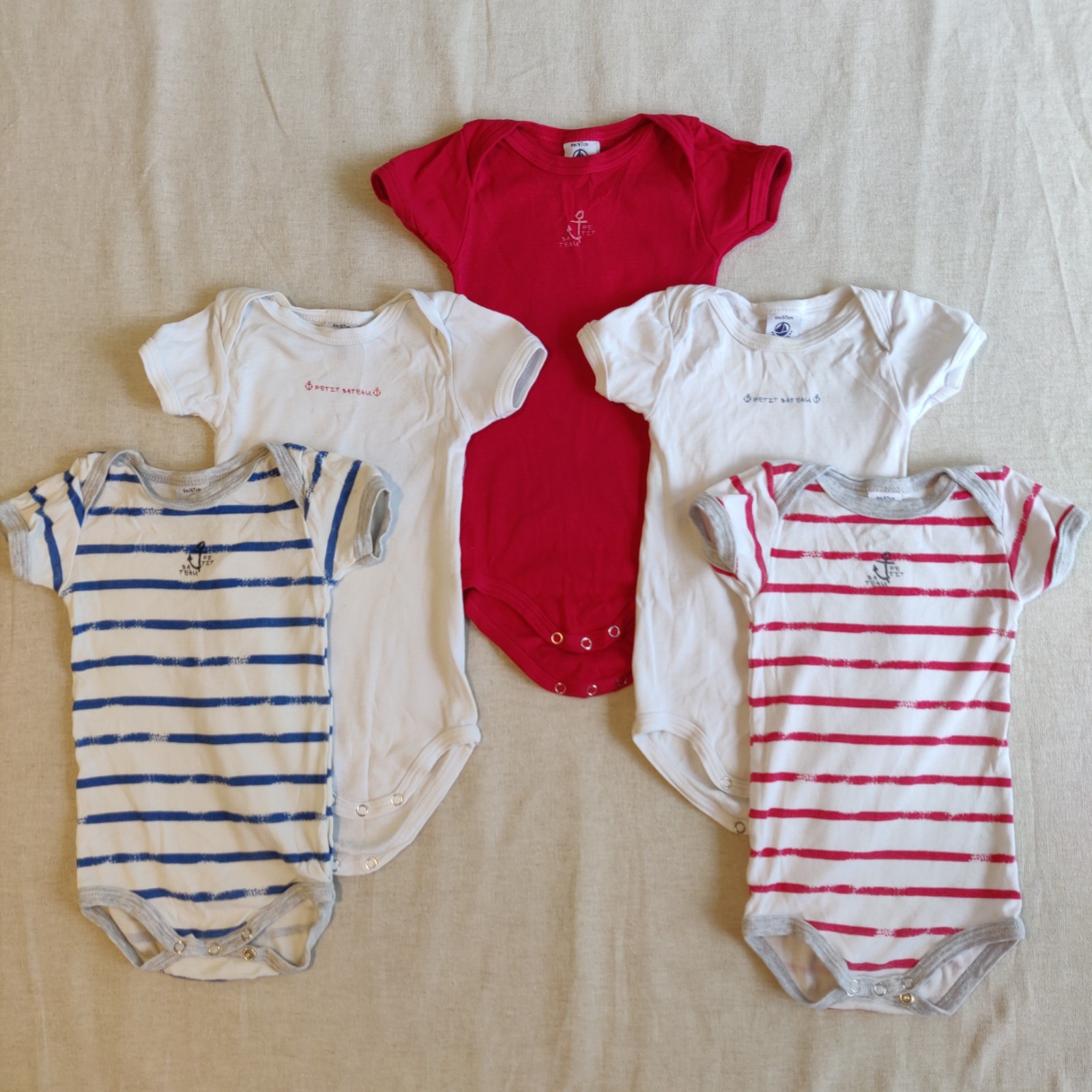 Autres commentaires : Lot de 5 bodies intemporels manches courtes thème marin, certains sont impeccables et d’autres ont plus servi et ont quelques tâches discrètes.