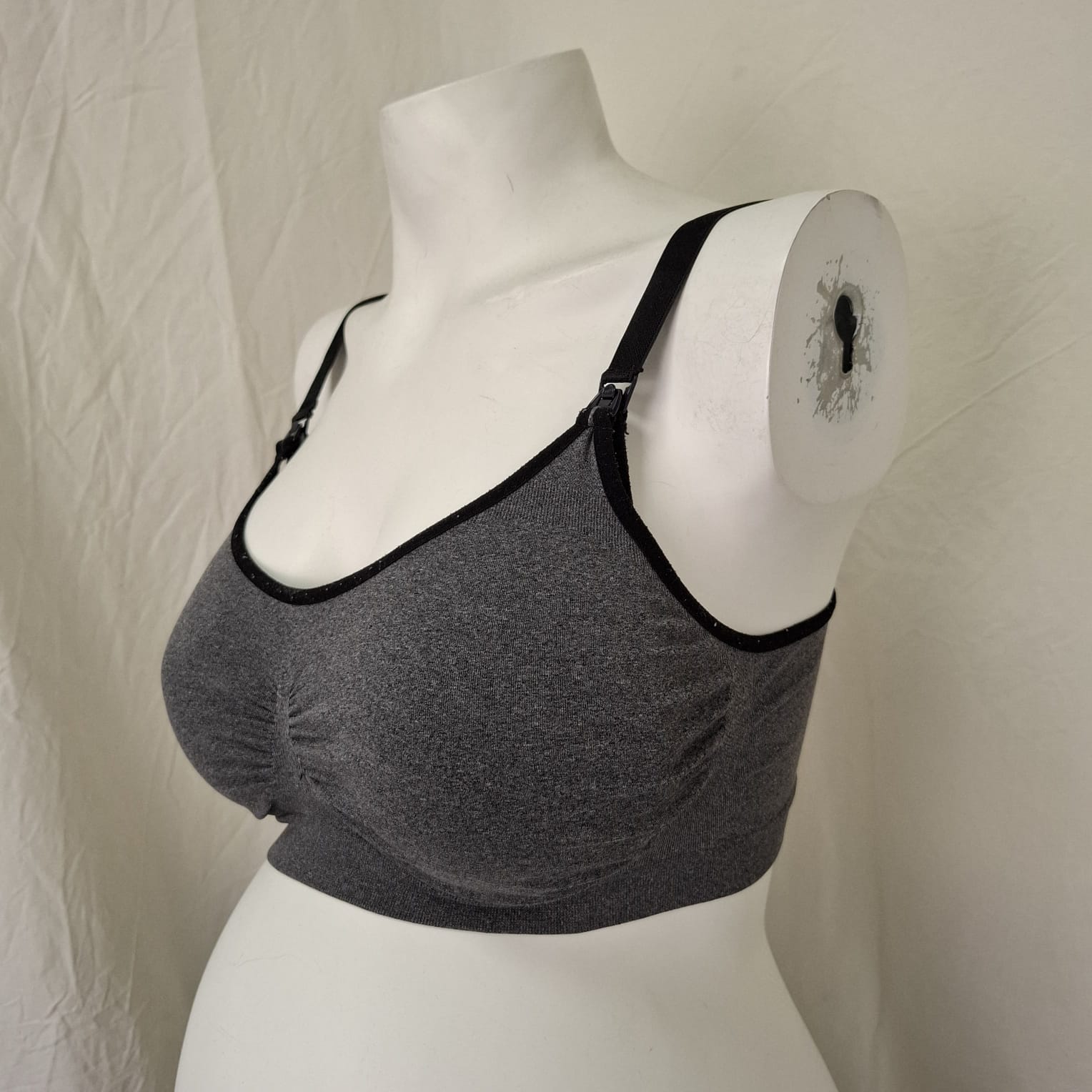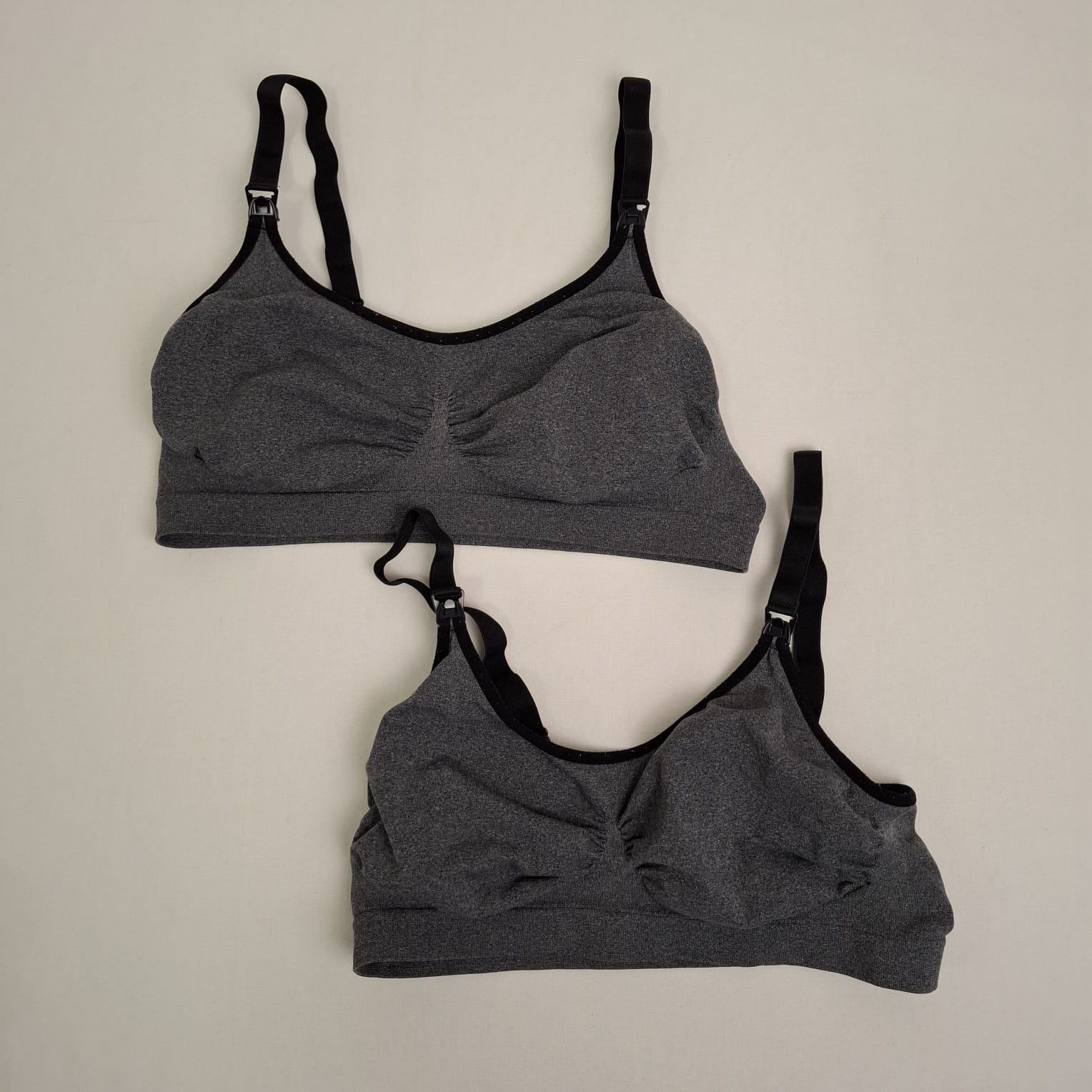 Autres commentaires : 33% polyester, 7% éladthanne. Lot de 2 brassières d’allaitement gris foncé, finition bord-côte à la base, ouverture des bonnets par un système de clips aux bretelles , taille L.