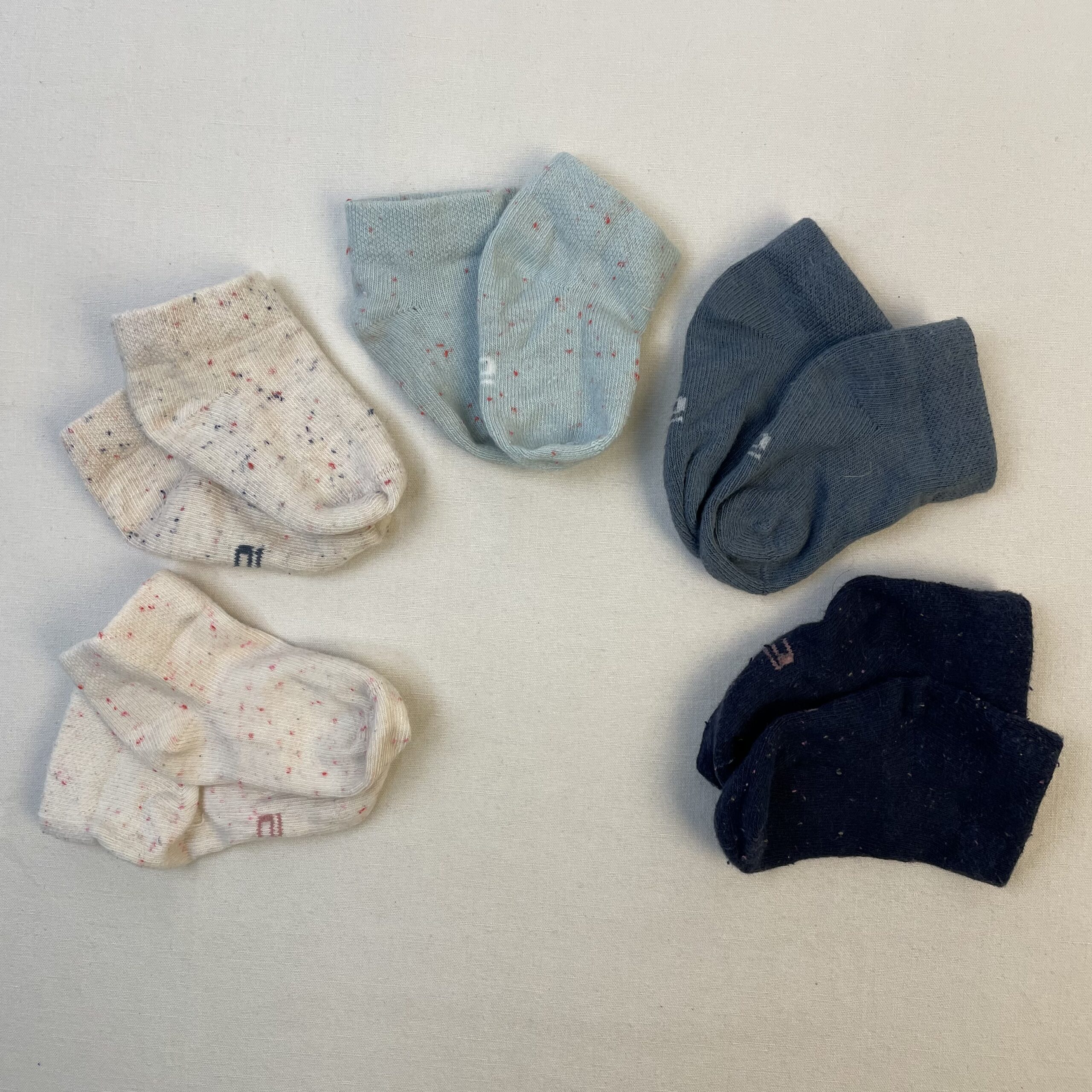 - Lot de 5 paires de chaussettes bébé P19-P22 : – 1 gris bleu. – 1 bleu marine. – 1 bleu clair à points roses. – 1 écrue à points colorés. – 1 écrue à points roses.