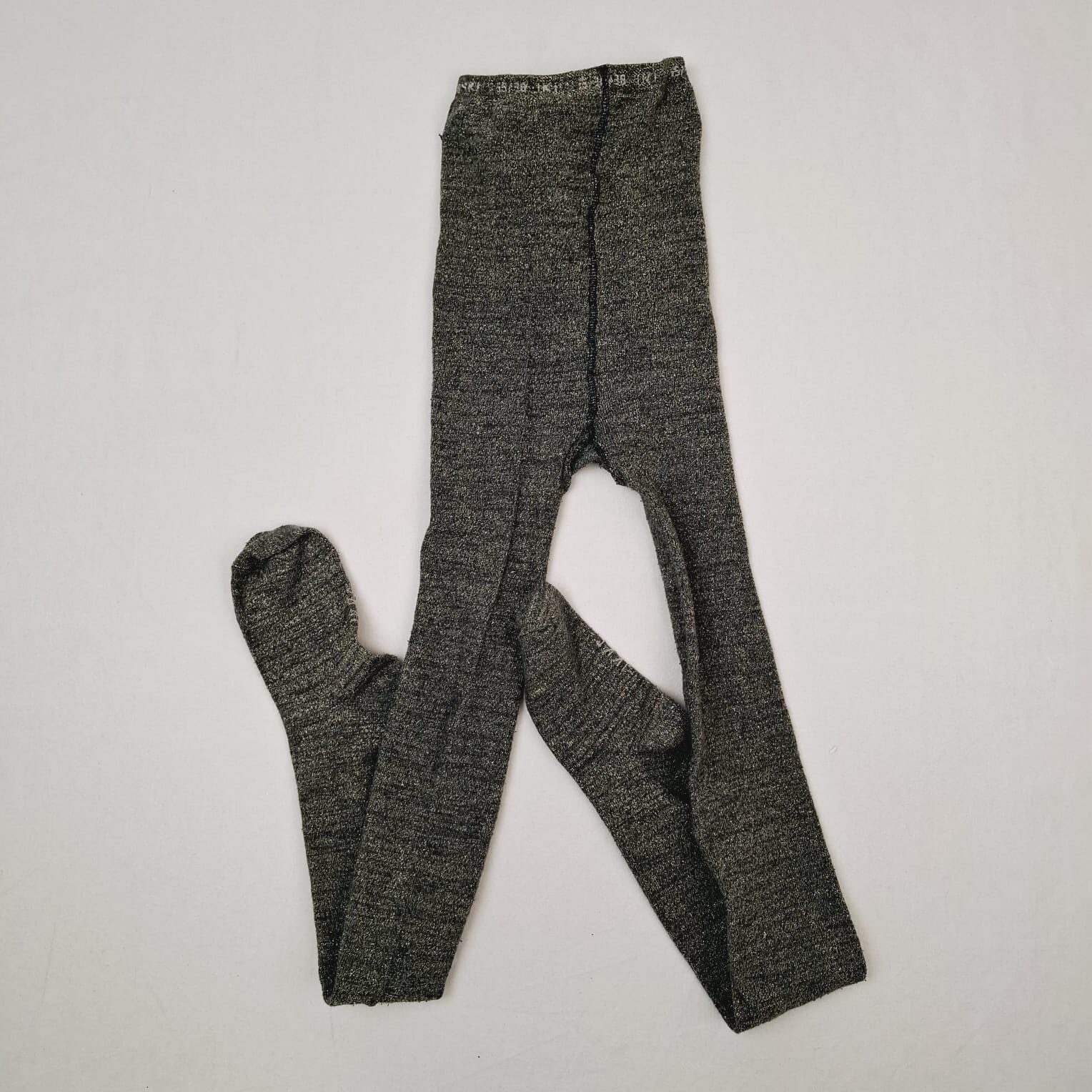 Autres commentaires : 30% polyester, 7% fibres métalliques et 2% élasthanne. Paire de collants gris foncés à paillettes dorées, taille élastiquée.