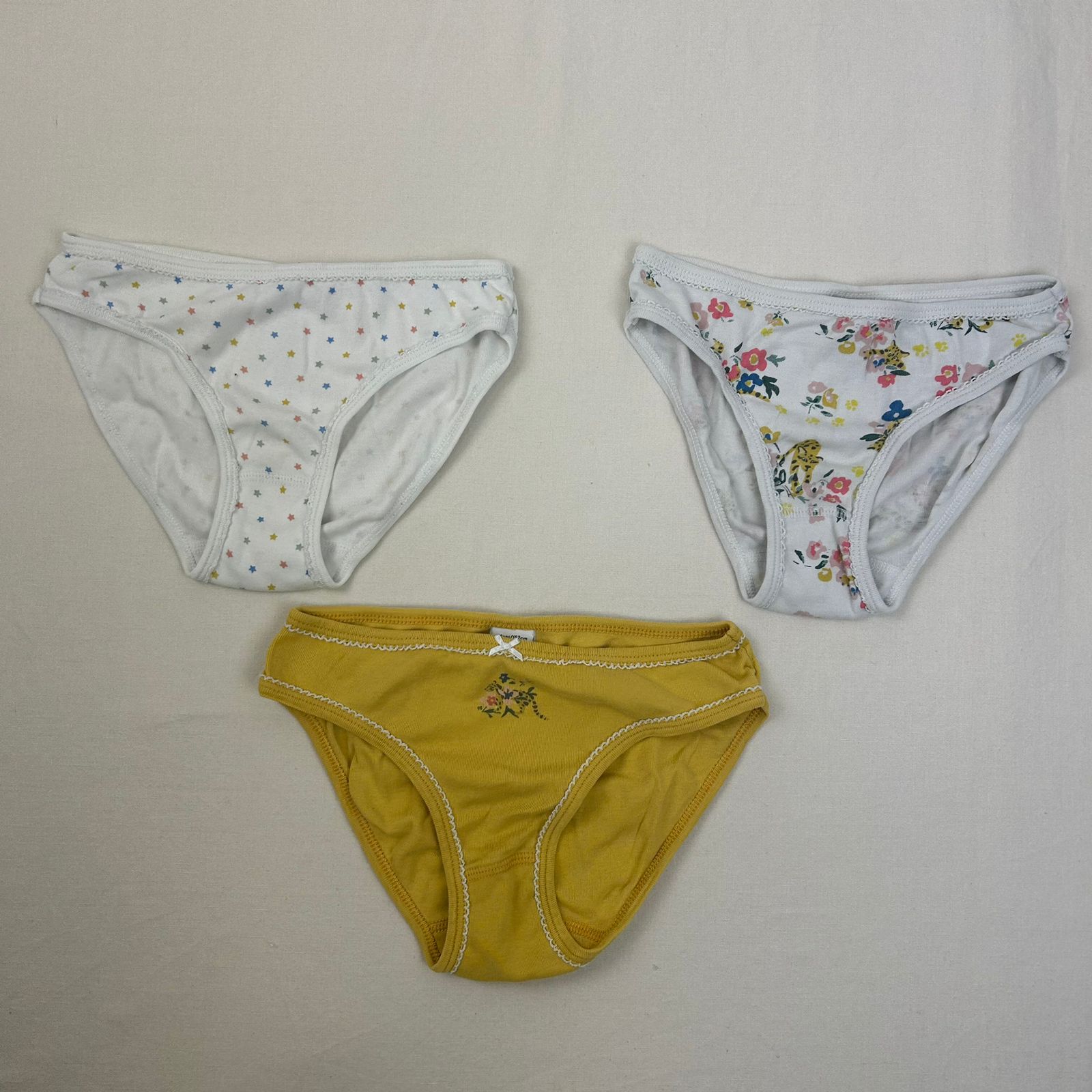 Autres commentaires : Lot de 3 culottes : -blanches avec des dessins de fleurs et de tigre , – jaune avec petit noeud, -blanche avec des étoiles colorées