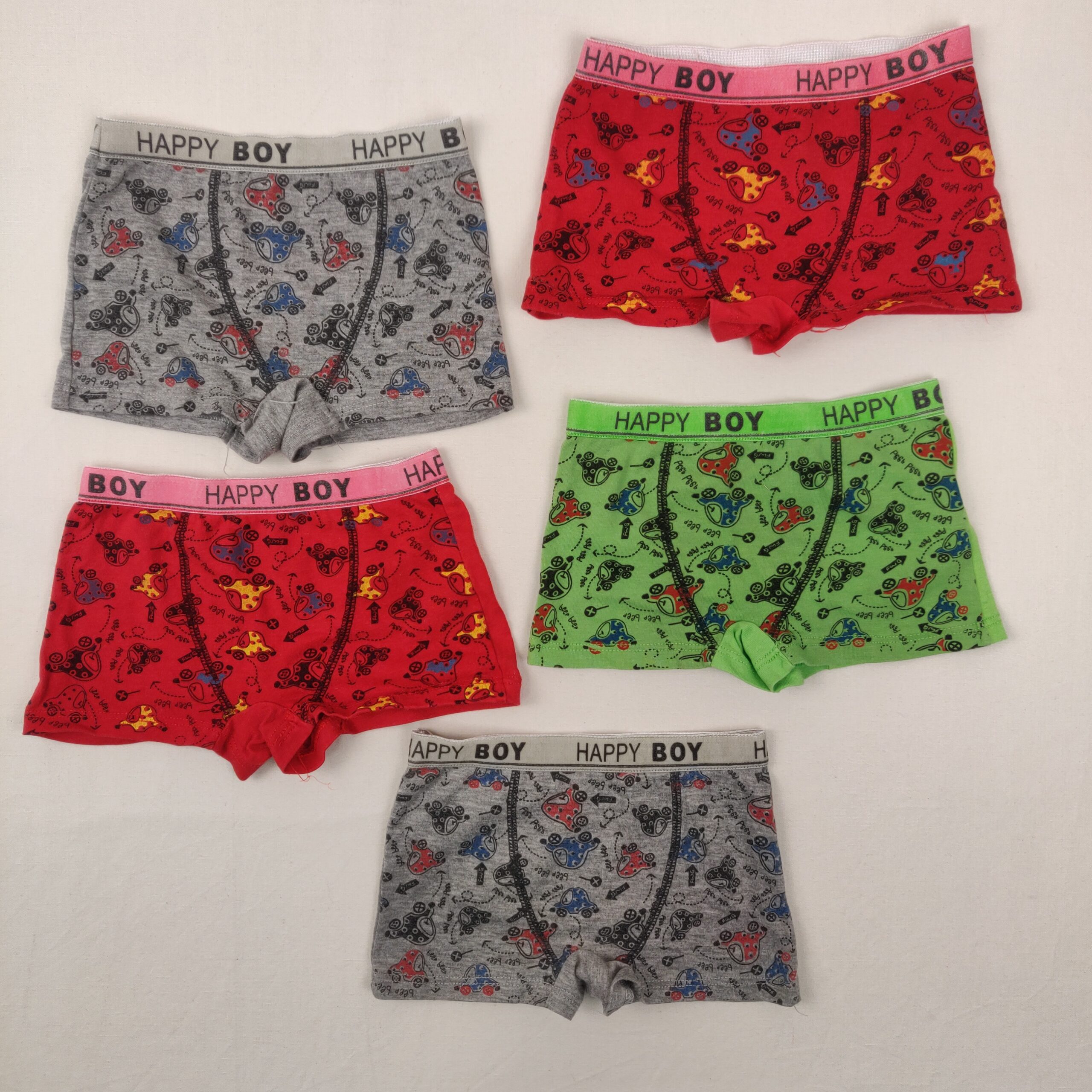 Autres commentaires : 5% élasthanne. Lot de 5 boxers : – 2 gris parsemé de mini voitures rouges, bleues, noires devant. – 2 rouges avec mini voitures jaunes, bleues et noires devant. – 1 vert pomme parsemé de mini voitures rougles, bleues et noires devant.