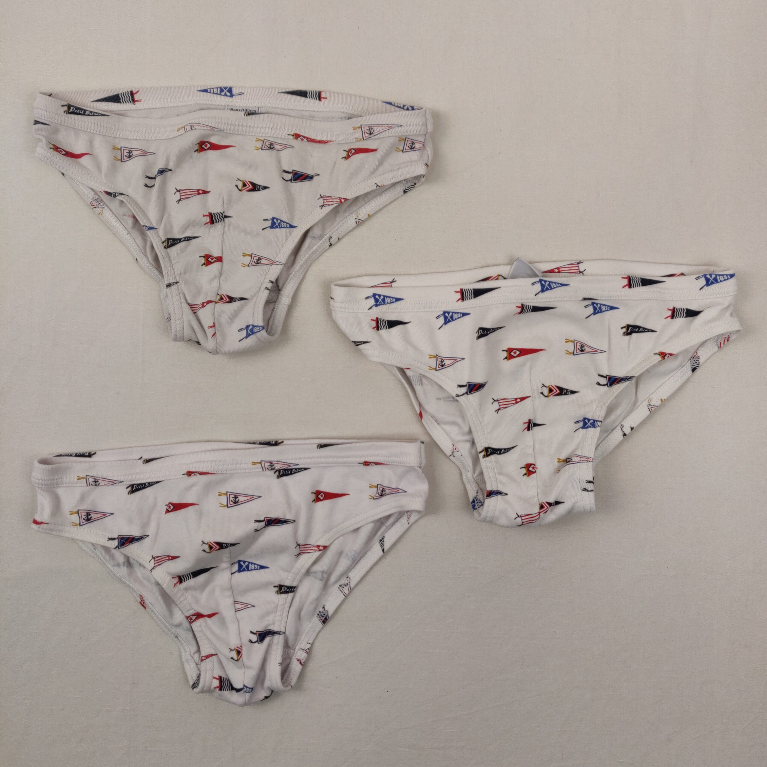 Autres commentaires : Lot de 3 slips blanc cassé parsemé de fanions divers bleus et rouges.