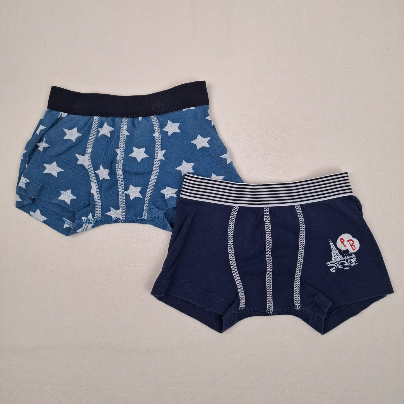 Autres commentaires : Lot de 2 caleçons boxers Petit bateau bleu, taille élastiquée dont un bleu avec étoiles et un bleu foncé.