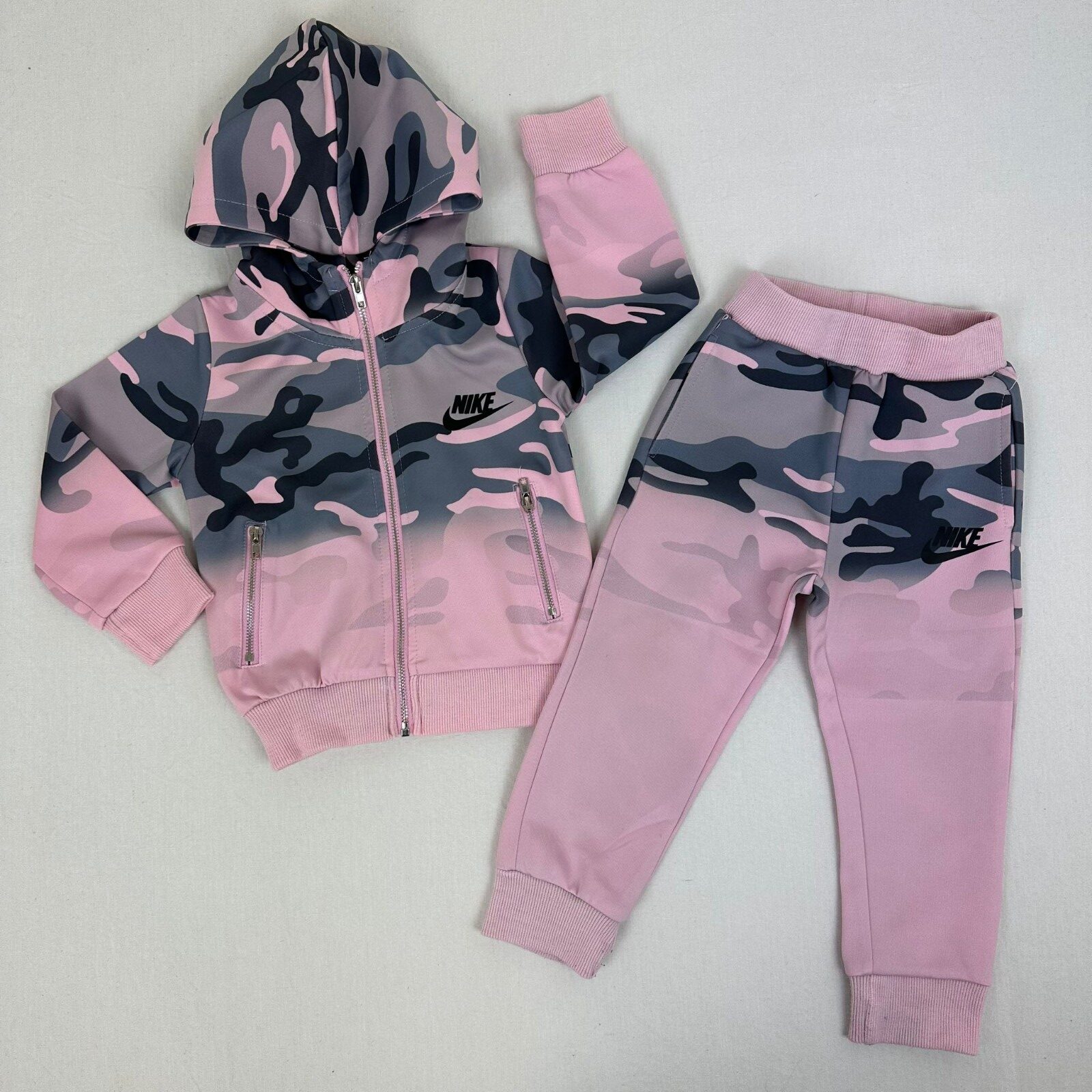 Autres commentaires : 5% elasthanne. Gilet manches longues rose avec capuche, 2 poches latérales et une fermeture en zip. Jogging rose du même motif avec une taille élastiquée. Imitation Nike.
