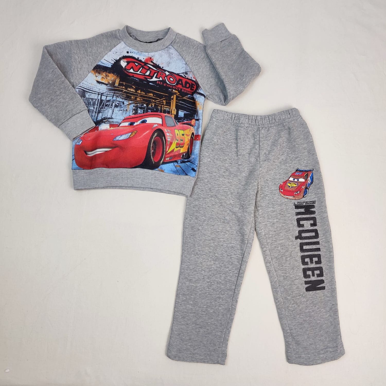 Autres commentaires : Jogging dont 1 Pantalon gris clair, motif Cars et inscription « Mc Queen », taille élastiquée et 1 Sweat manches longues gris clair assorti, col rond, motif voiture rouge de Cars, Petit défaut : petite tache sur la manche droite. Niveau réduit de Fraise à Myrtille.