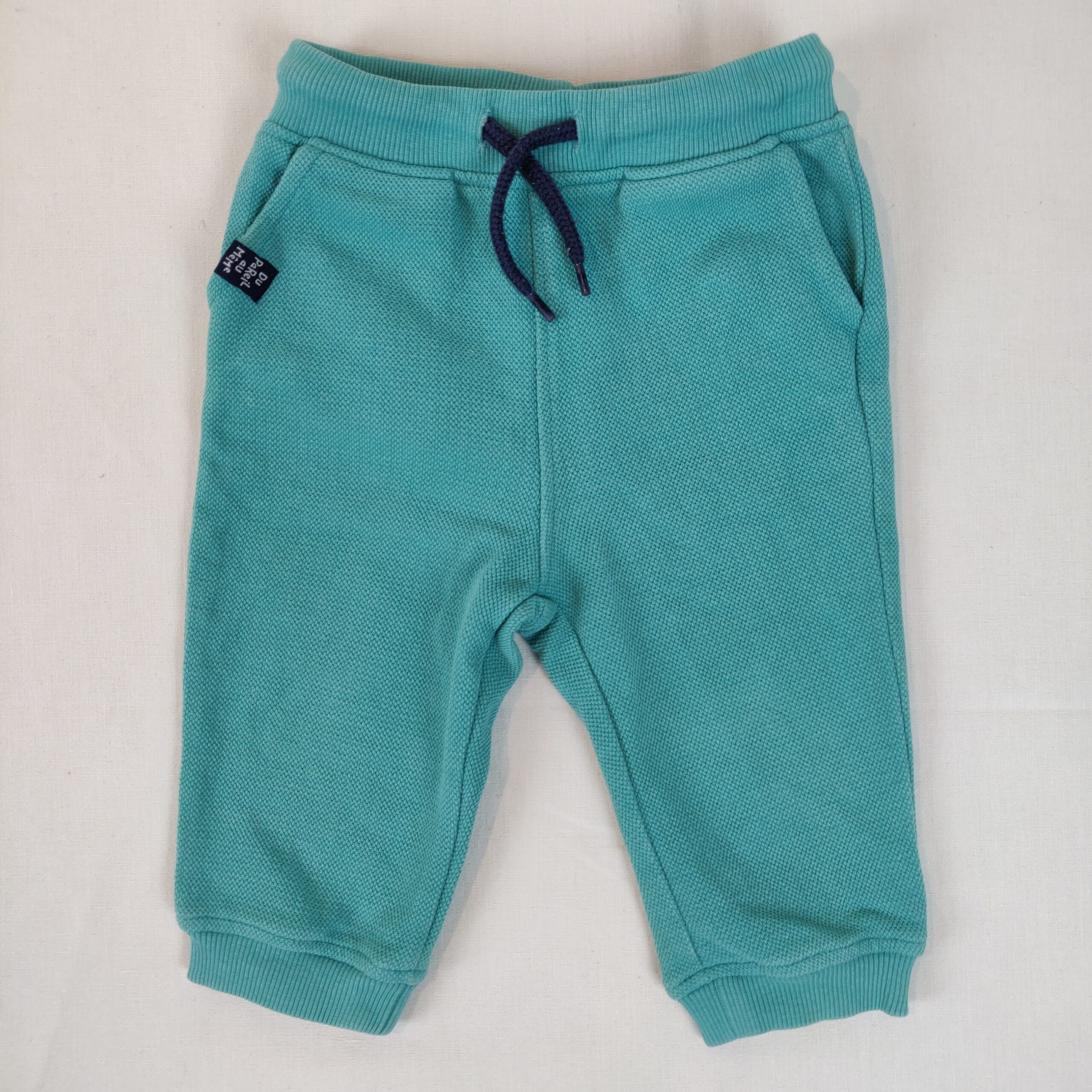 Autres commentaires : Pantalon de jogging – bleu turquoise – taille élastique à cordon bleu marine. 2 poches latérales. Chevilles élastiques façon tricot. Petit motif panda à l’arrière.