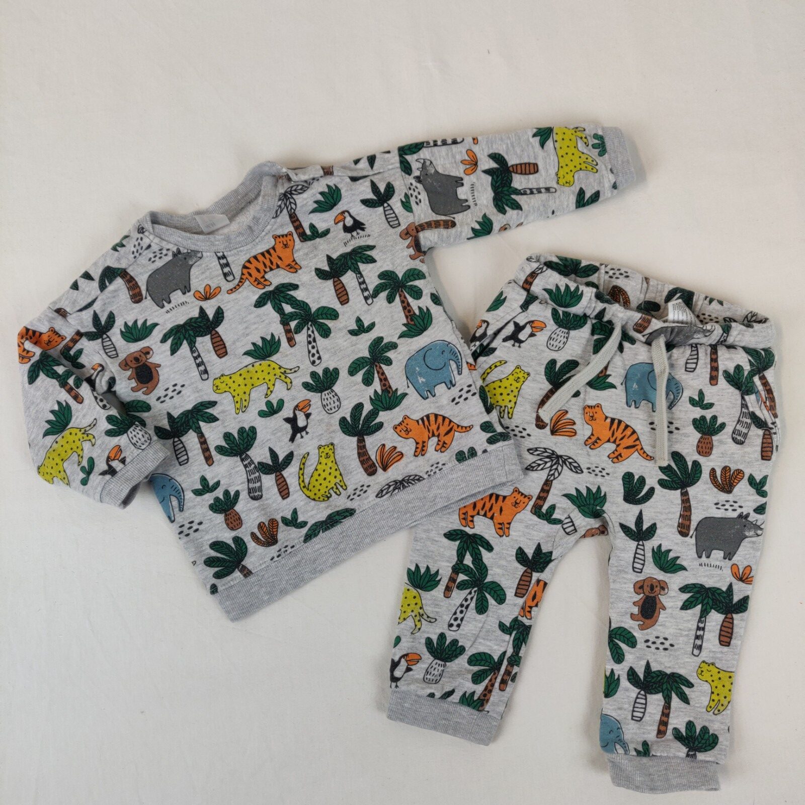 Autres commentaires : 17% polyester, 3% viscose. Ensemble de jogging – gris chiné. Motifs relatifs aux animaux de la jungle. Haut à manche longues. Ouverture latérale à 2 presssions. Quelques tâches marrons discrètes au centre. Un pantalon de jogging assorti. Taille élastique avec un cordon interne gris.