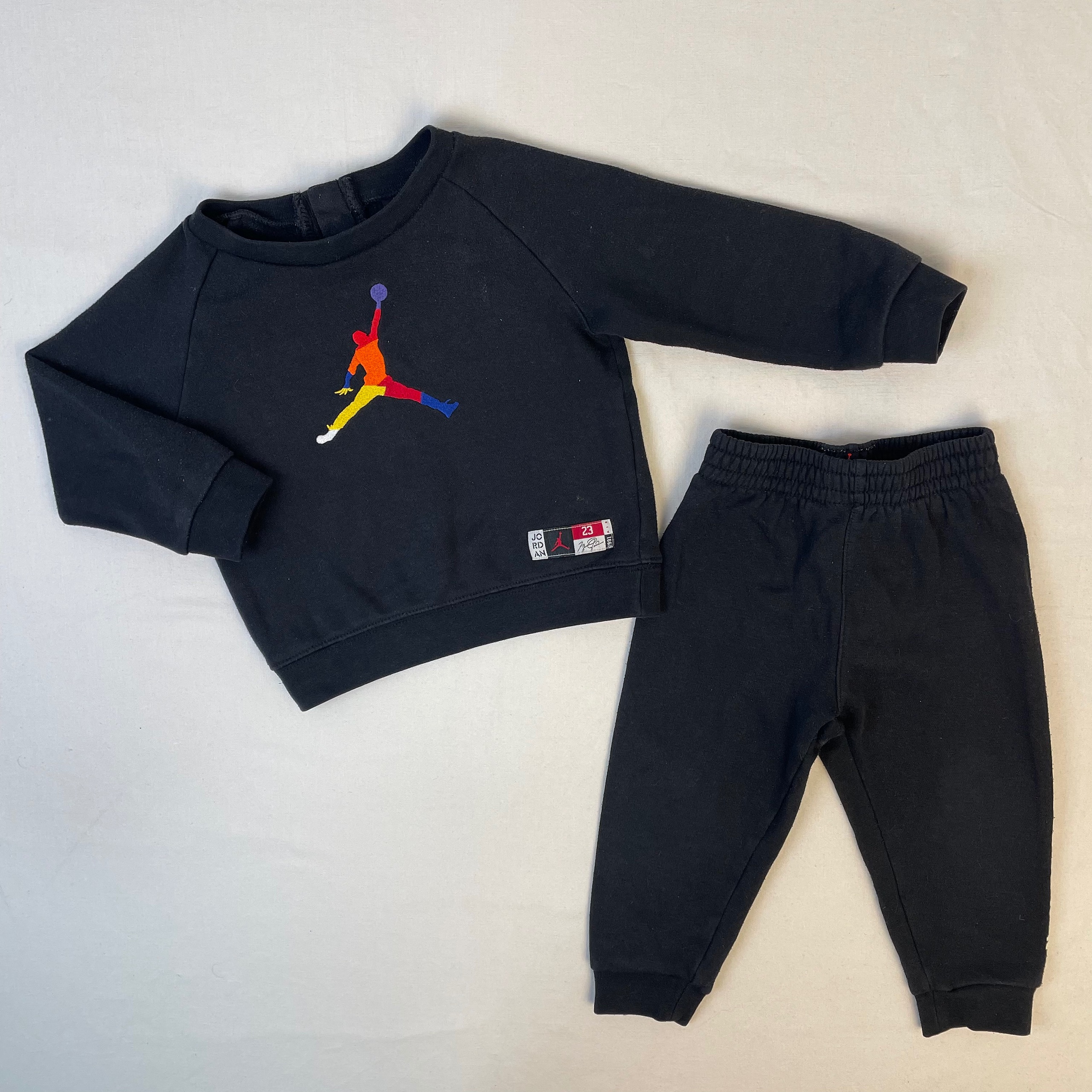 - Esemble de jogging JORDAN noir. Un sweat noir avec le personnage multicouleure cousu au centre avec une petite ouverture sur le dos via 2 boutons de préssion et un pantalon de jogging noir avec écrit « jordan » en muticouleur sur la longueur de la cuisse gauche.