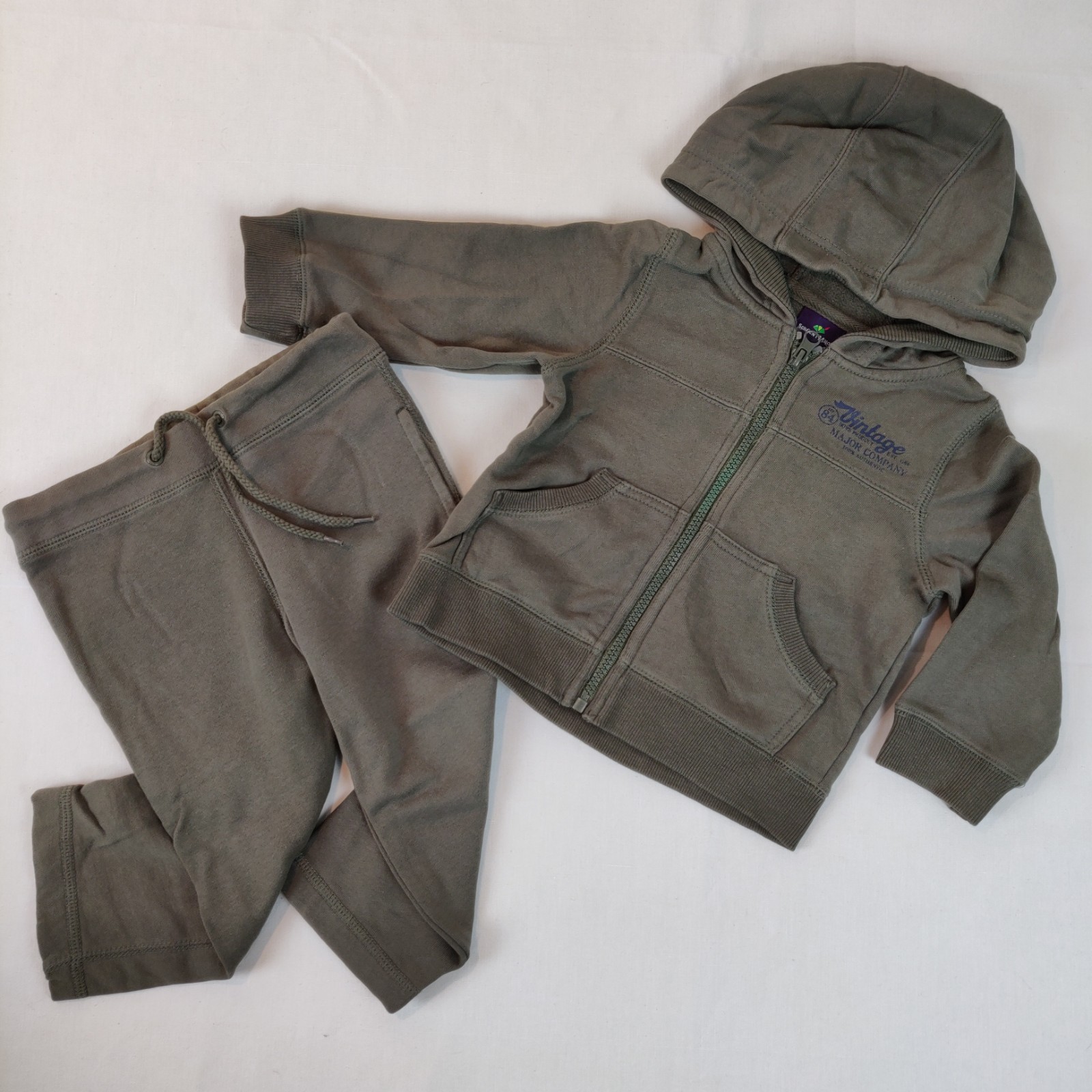 Autres commentaires : Ensemble haut et bas de jogging – vert kaki. Pantalon de jogging – cordon à la taille. 2 poches latérales. Gilet à capuche (dont le cordon est manquant) – ouverture centrale à fermeture éclair. 2 poches latérales.