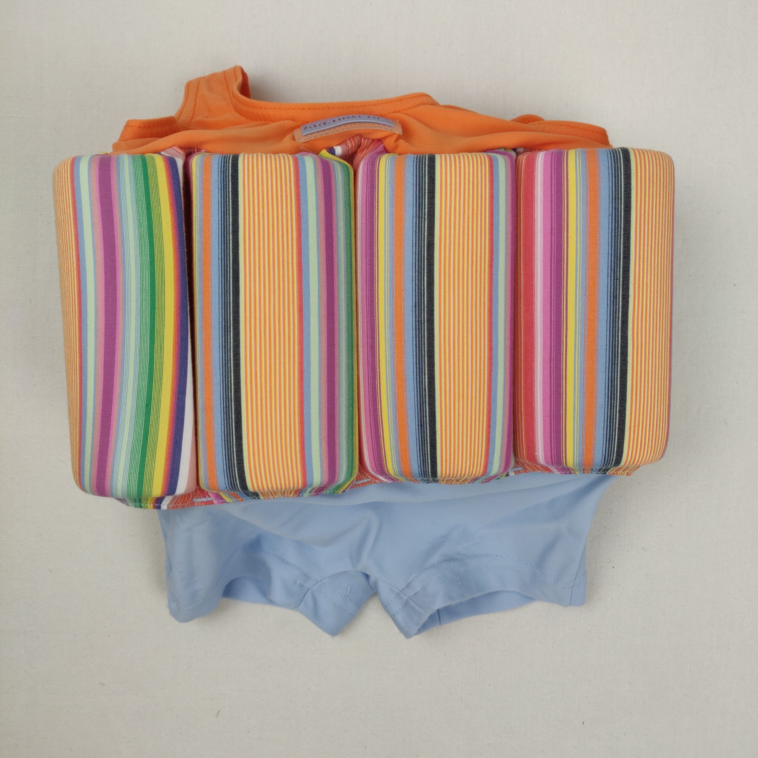 Autres commentaires : 20% lycra – Maillot de bain – bouée avec flottteurs intégrés, cette combinaison se compose d’une partie shorty bleu ciel, d’une partie centrale avec les poches de flotteurs rayées orange et mulicolores, et d’une partie haute à bretelles orang, fourni avec sa pochette plastique d’origine avec poignée et fermée par un bouton pression.