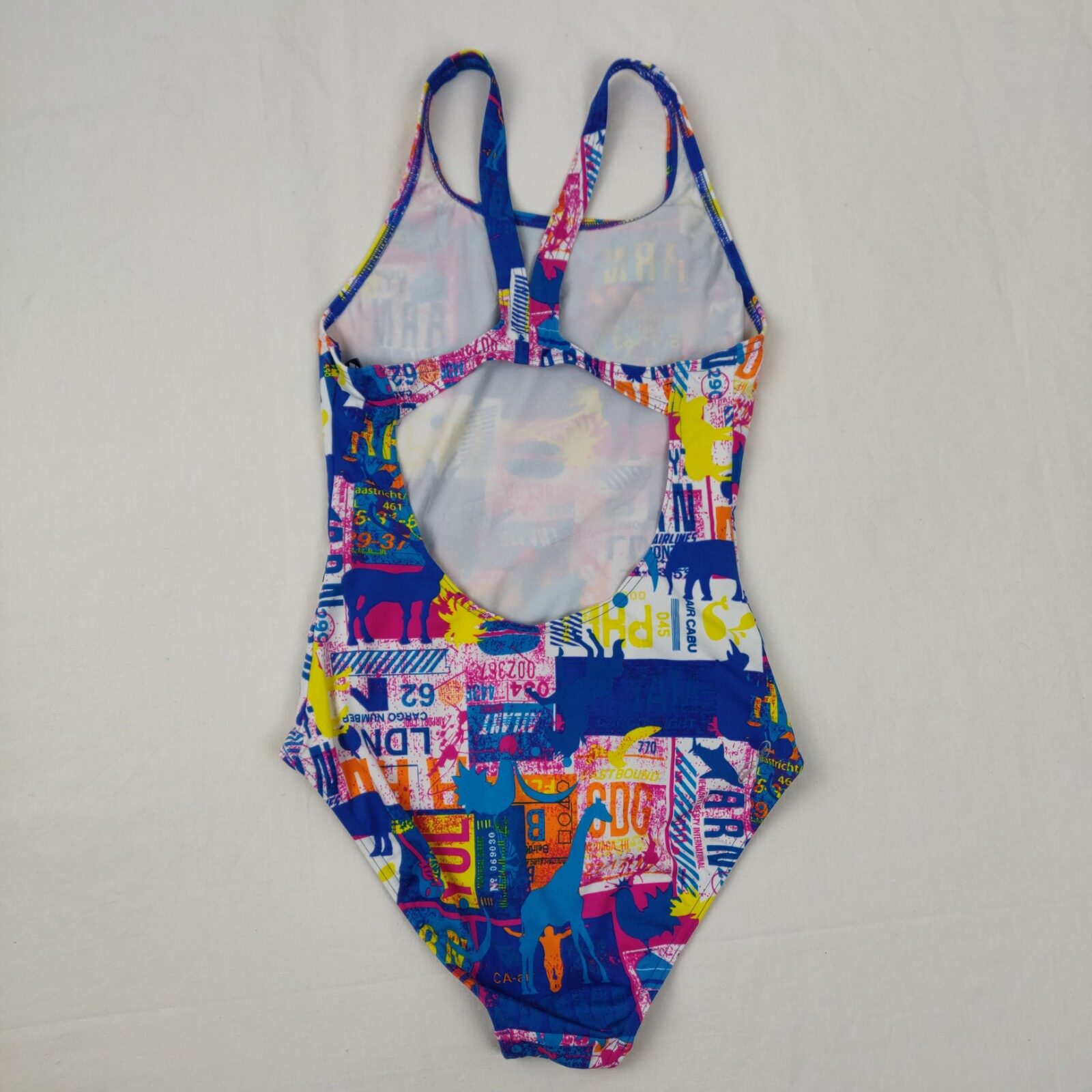 Autres commentaires : Maillot de bain une piéce bleu avec motif multicolore rose, bleu, blanc et jaune.Taille M