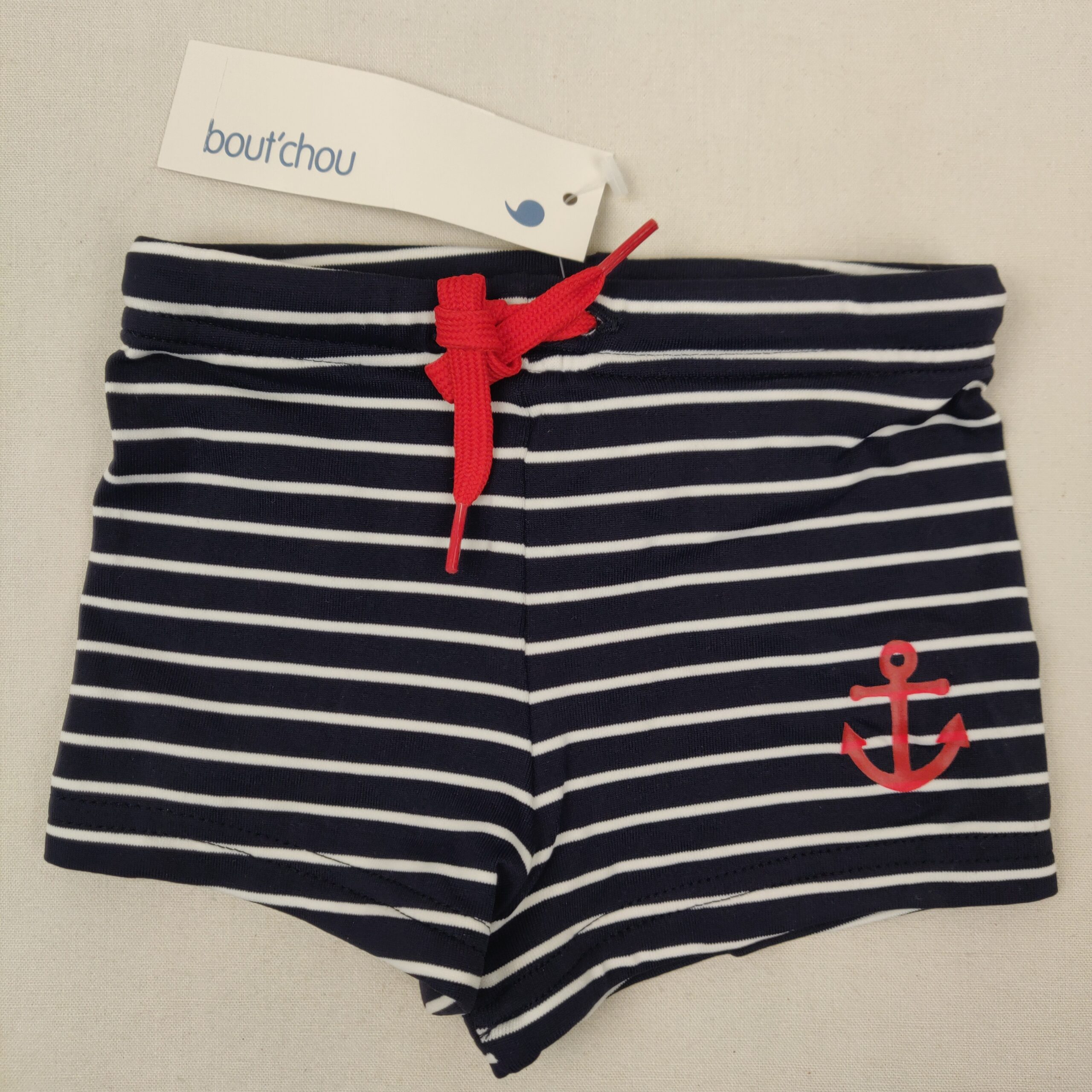 Autres commentaires : Shorty de bain bleu marine à rayures blanches, taille élastiquée avec cordon, imprimé ancre rouge sur la cuisse gauche. Neuf.
