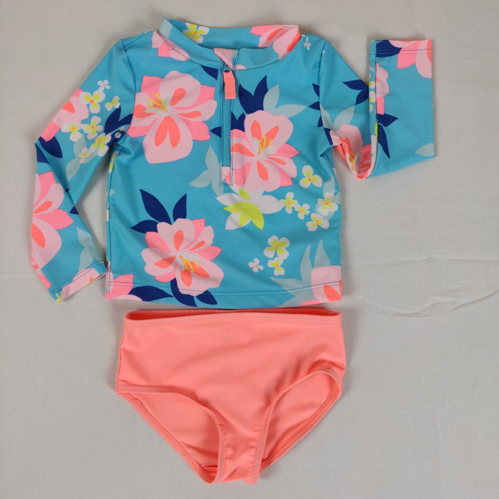 Autres commentaires : T-shirt anti UV manches longues zippé bleu ciel à fleurs saumon et jaunes, et bas de maillot uni saumon. Manches du t-shirt un peu râpées.
