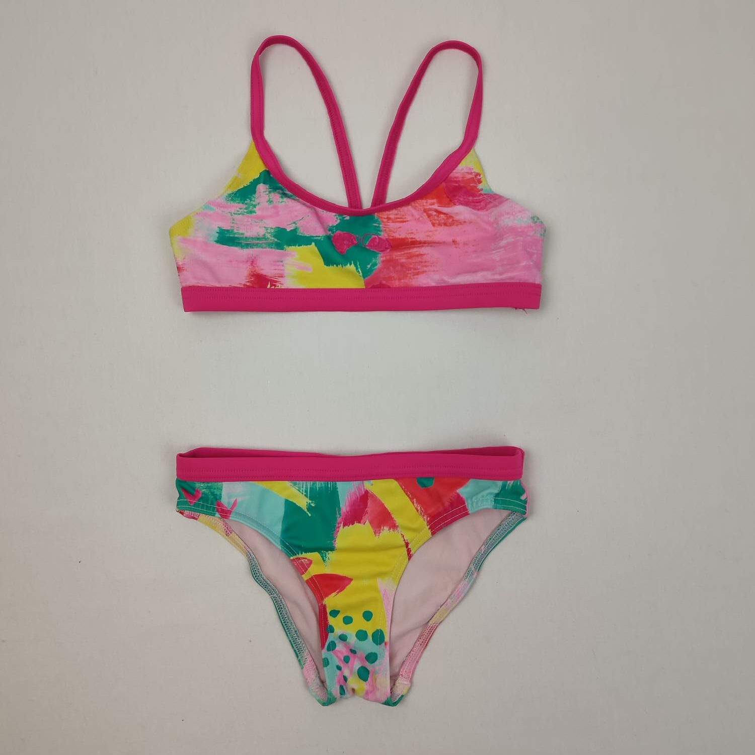 Autres commentaires : Maillot de bain 2 pièces Nabaiji, multicolore à liseré rose fushia, culotte et brassière à bretelles non croisées. Taille estimée 6 ans.