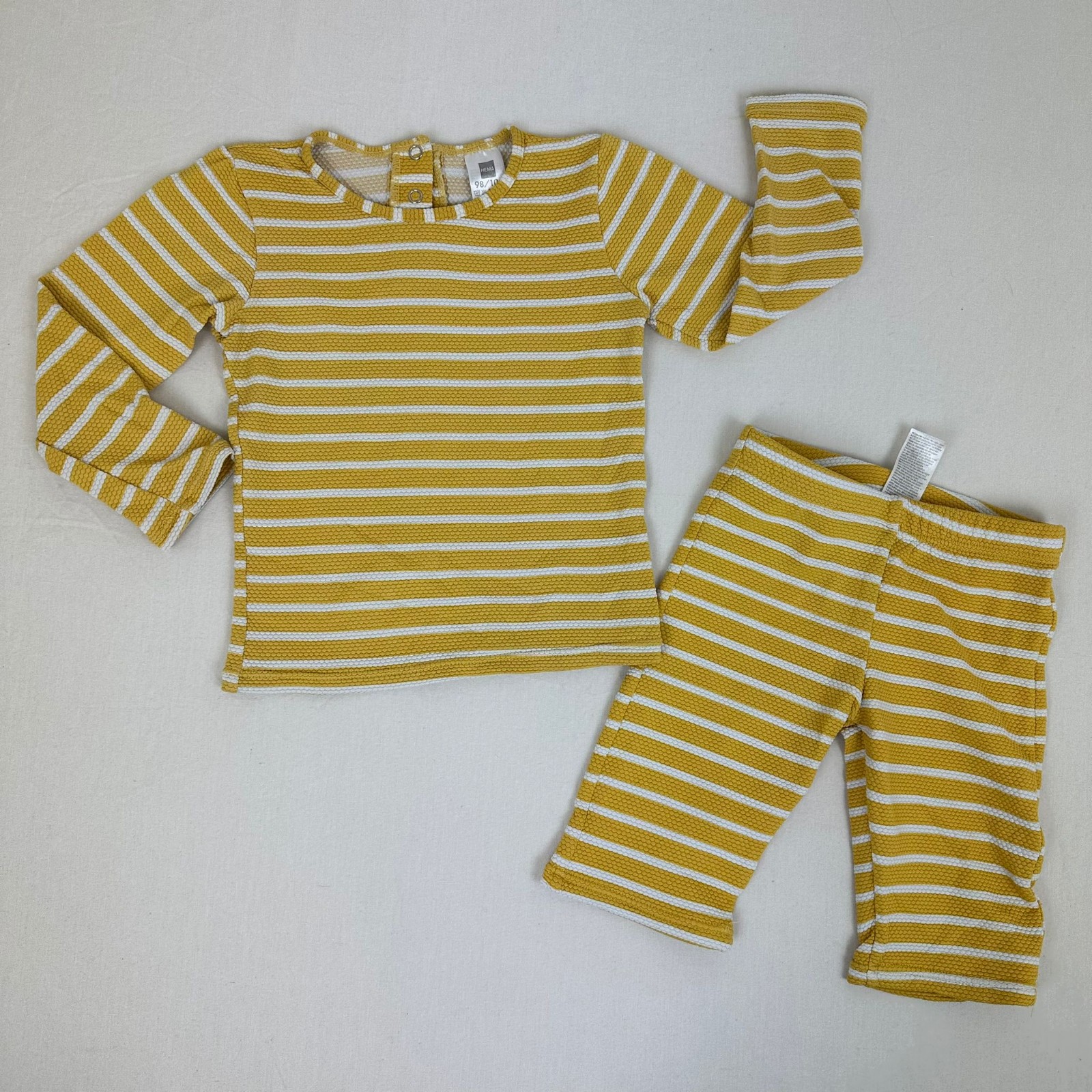 Autres commentaires : 4% elasthanne. T-shirt manches longues jaune avec rayures blanches et une fermeture avec boutons pressions au dos. Legging jaune du même motif avec taille élastiquée.