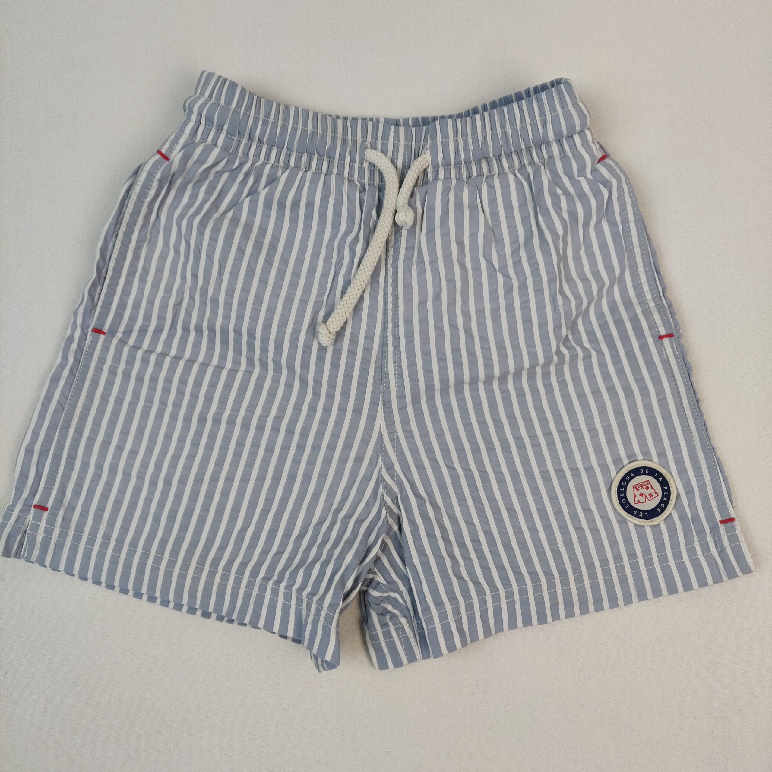 Autres commentaires : 30% Polyester avec slip-filet intérieur en 100% Polyester, short de bain à rayures blanches et grises, macaron en relief avec le logo, taille élastiquée réglable par codons blancs.