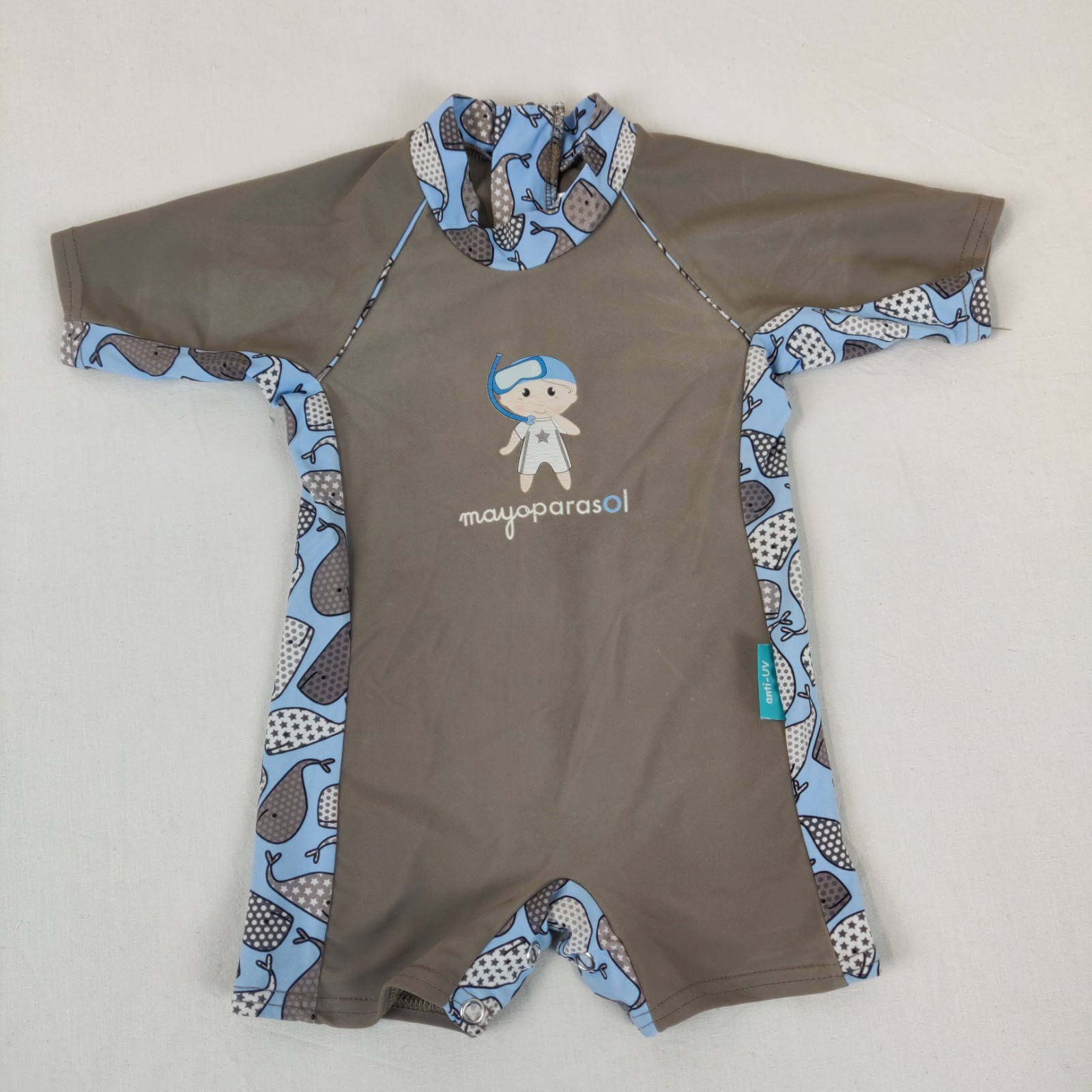 Autres commentaires : Maillot de bain une pièce combinaison à manches courtes – gris. Bandes latérales et col – bleu à motifs baleines. Motif central petit baigneur accompagné de l’inscription « Mayoparasol ». Ouverture centrale au dos zippée. Usure normale.