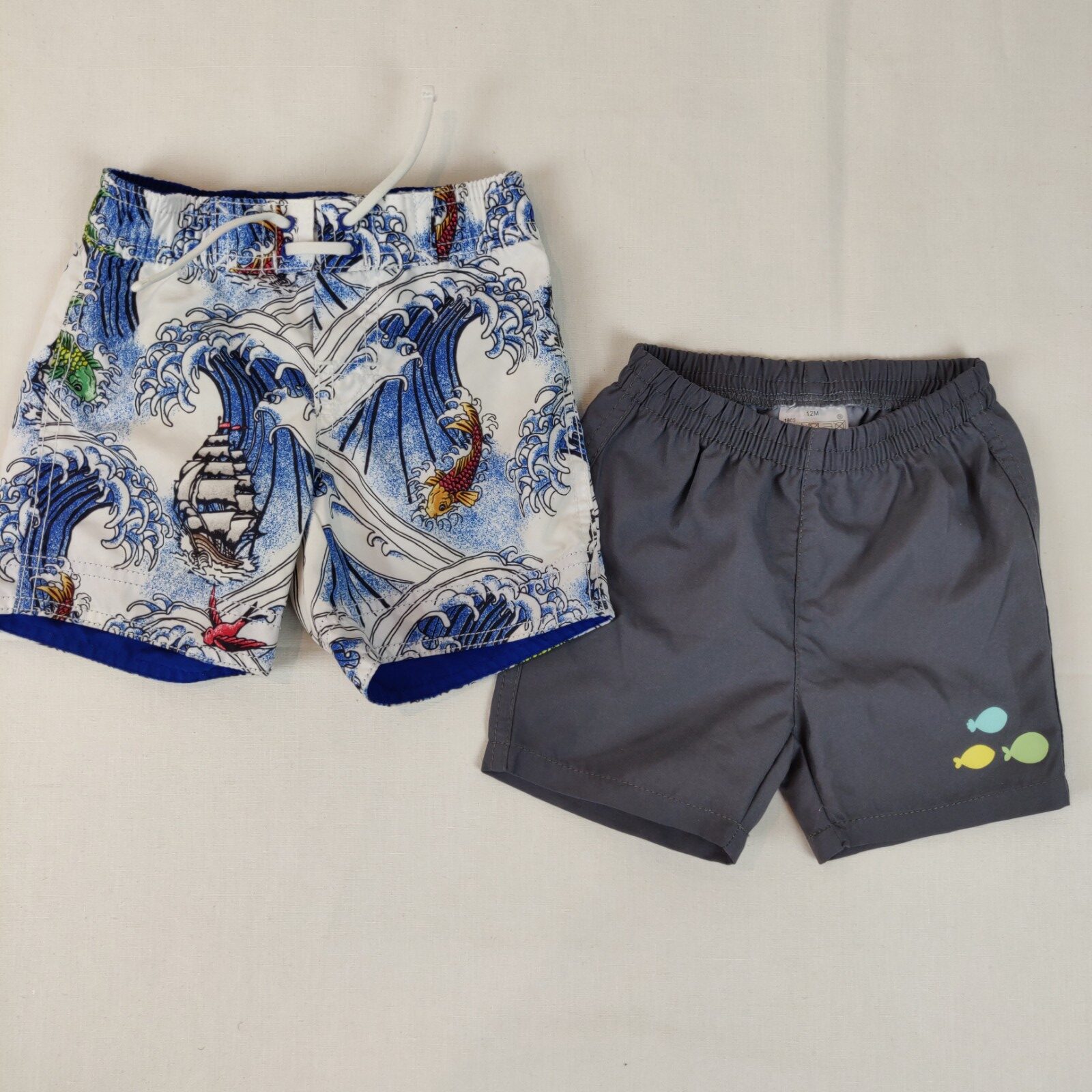 Autres commentaires : Lot de 2 shorts de bain. Short de bain Baby Gap – blanc avec motifs marins – taille élastique et cordon à la taille. Short de bain sans marque – vert kaki- gris avec motifs latéraux poissons. Taille élastique.