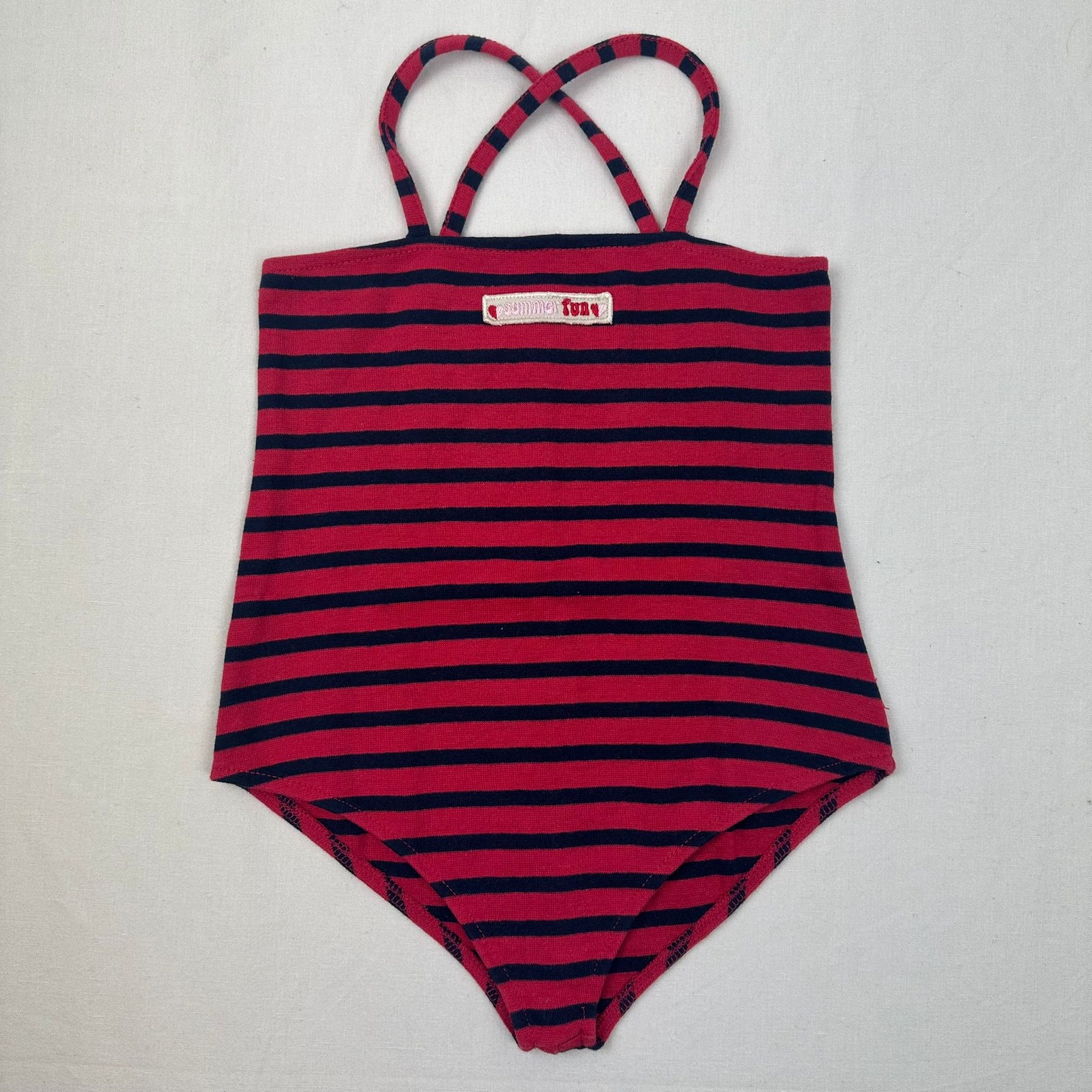 Autres commentaires : 4% spandex. Maillot de bain une piéce rouge avec rayures bleu foncé et dos croisé.