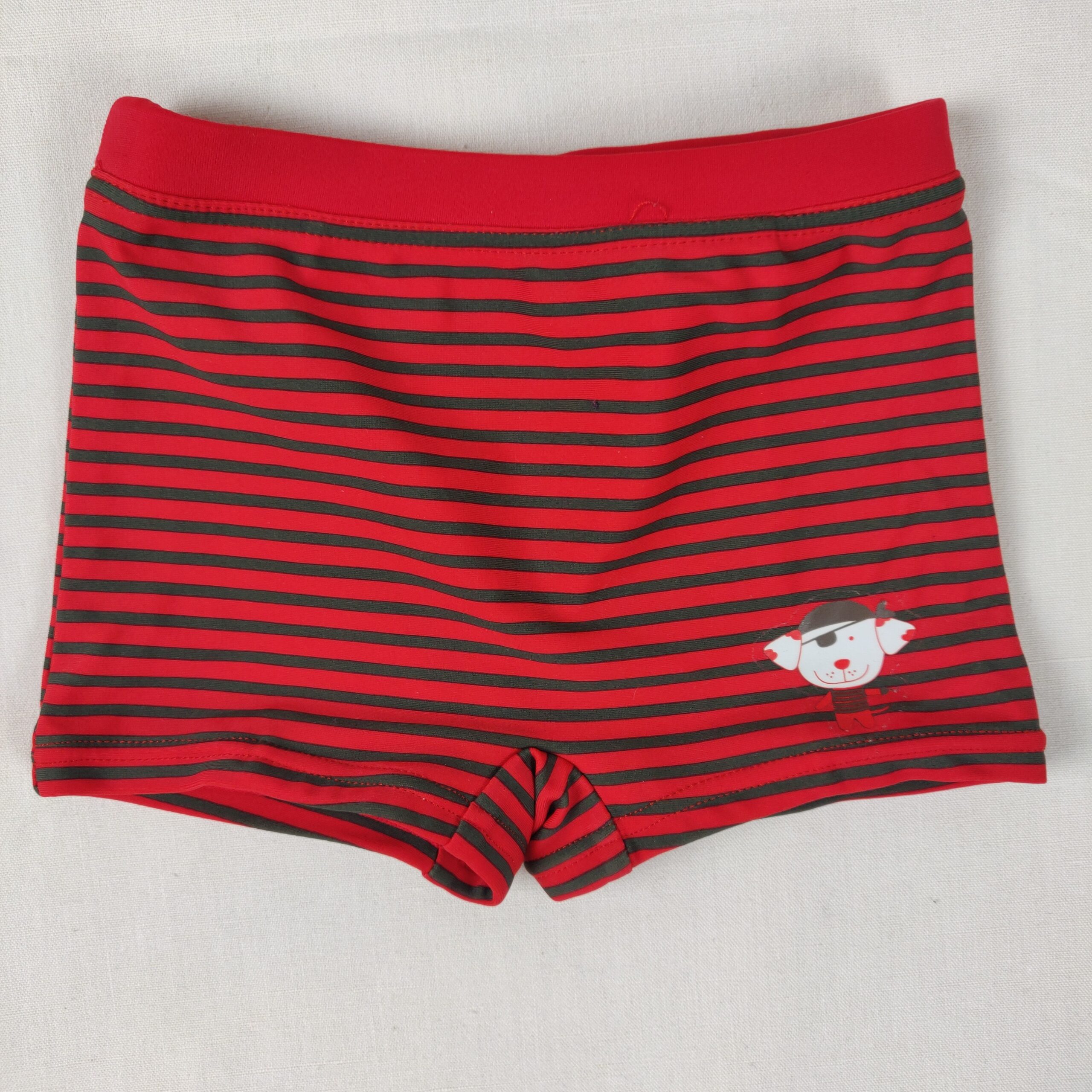 Autres commentaires : Short de bain rayé rouge et marron, avec tête de chien pirate.