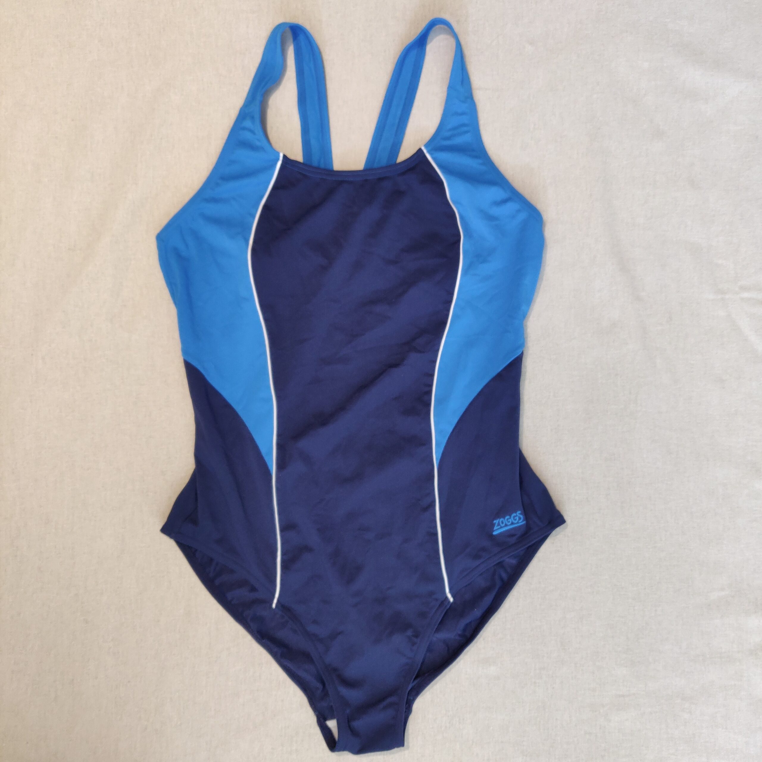 Autres commentaires : Maillot de bain dos ouvert, bleu foncé et bleu roi, liseré blanc, quelques traces d’usage mais très bon produit.