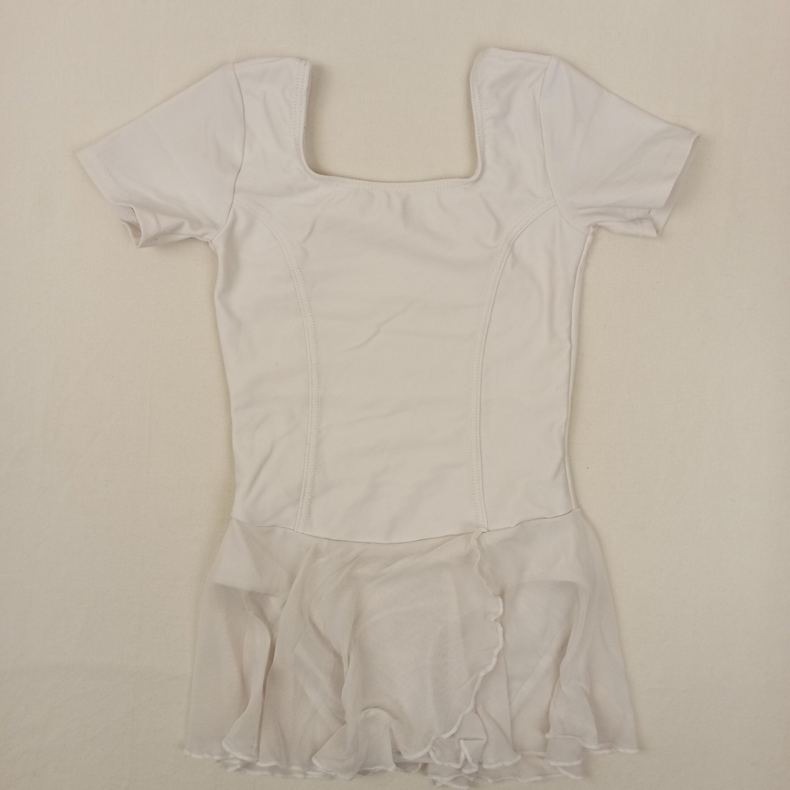 Autres commentaires : 20 % élasthanne. Justaucorps de danse blanc Vicard, col carré, partie jupe en tissu transparent.