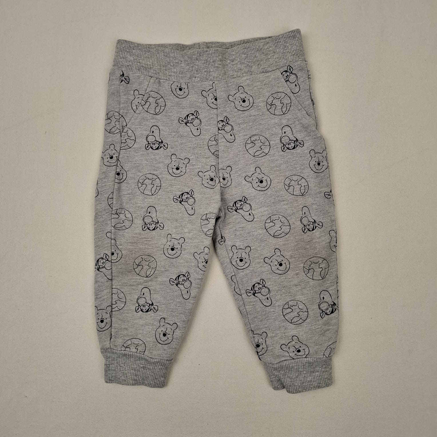 Autres commentaires : 7% polyester et 4% élasthanne. Pantalon sportswear gris parsemé de planètes terre et de la tête de personnages Winnie l’ourson et Tigrou, taille et chevilles élastiquée (bord côte)