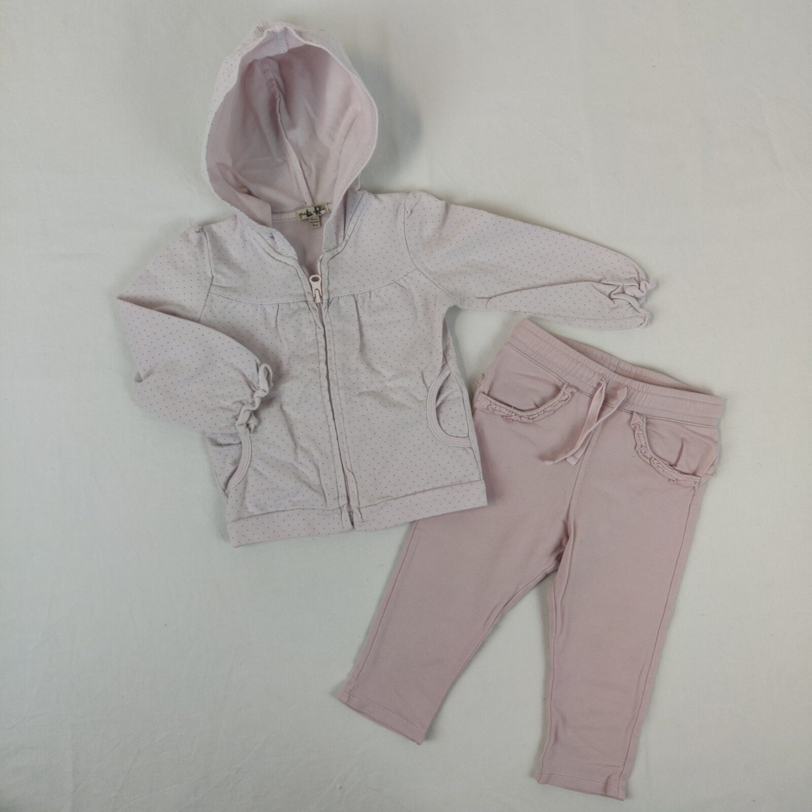 Autres commentaires : 4% élasthanne. Pantalon de jogging – rose. Taille élastique avec cordon interne rose. 2 poches latérales froncées. Un bande froncée à l’arrière. Un gilet à capuche Grain de blé – rose à pois gris offert avec quelques tâches au devant.