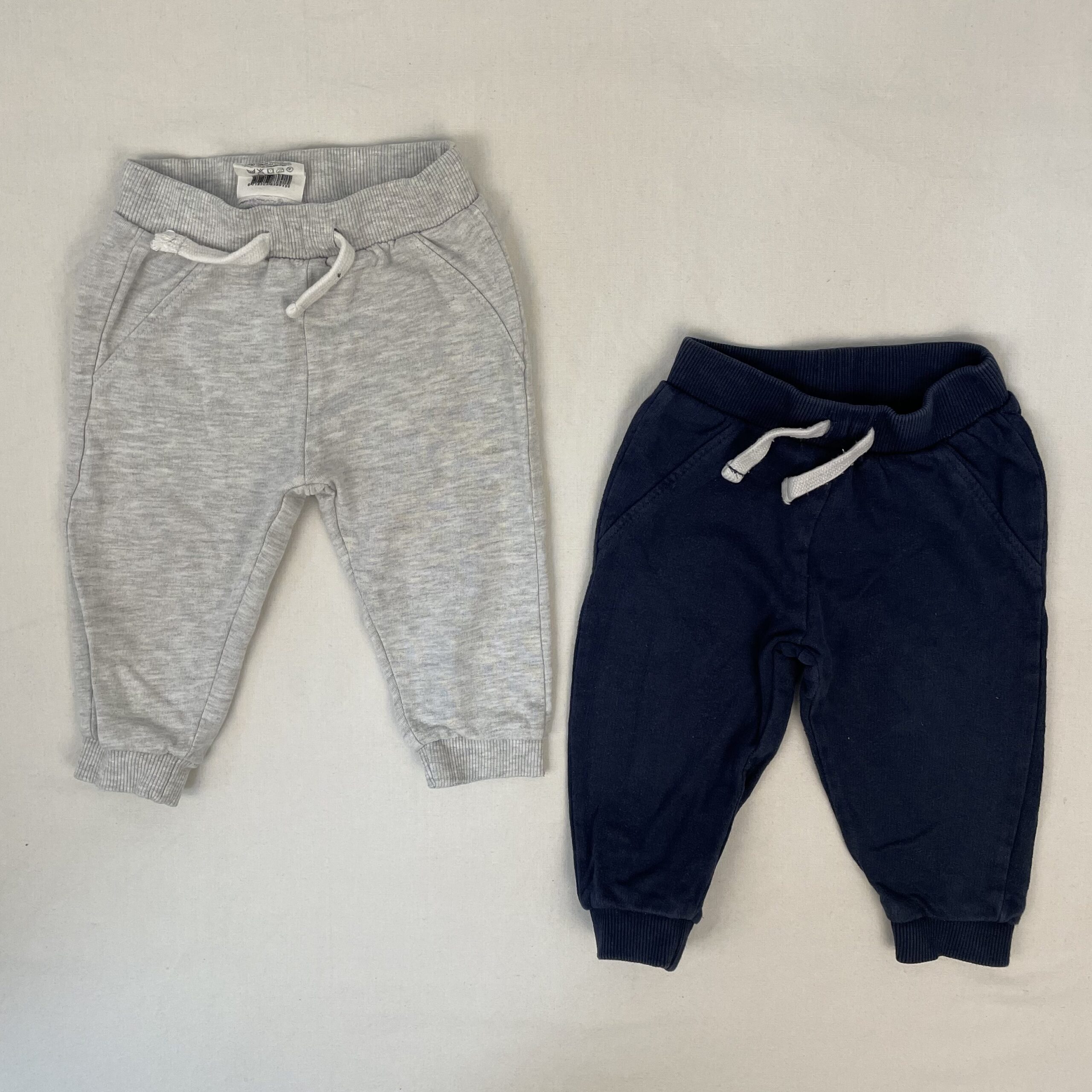 - Lot de 2 pantalons bleu foncé et gris clair, taille et chevilles élastiquées, ceinture avec cordon.